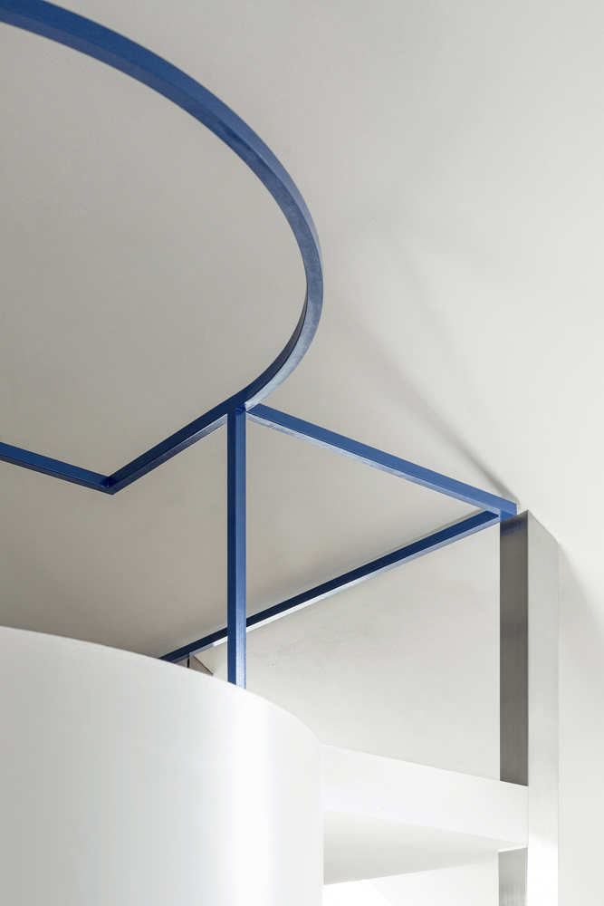 空间的垂直连接由半圆柱形楼梯提供,由三个简单元素组成:天然大理石(前两个独立台阶中的特征)、钢(楼梯中间部分)和木材(后两个台阶引入卧室)。楼梯的曲线形状与公寓的刚性几何结构形成鲜明对比,并由一个轻管状元素支撑,该元素按比例设计,以强调室内空间的连续性。