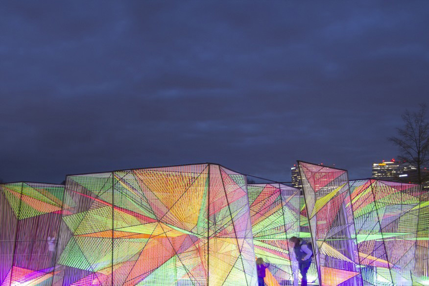 由钢筋框架和彩虹线制成,并由一系列室外紫外线发光二极管照明,充满活力的线艺术装置是在一个月内与Arup的高级结构工程师乔丹·伍德森(Jordan Woodson)合作制作和组装的。公司的联合创始人乔希·德·苏萨对建筑师说:“我们在设计(棱镜)时考虑了几个目标。”“我们想用线性元素定义大量的空间,从而提供透明度,创造云纹和色彩混合效果。我们还想建造一种重量轻、但耐用的结构。”
