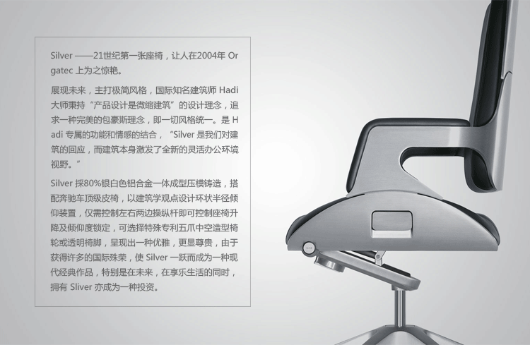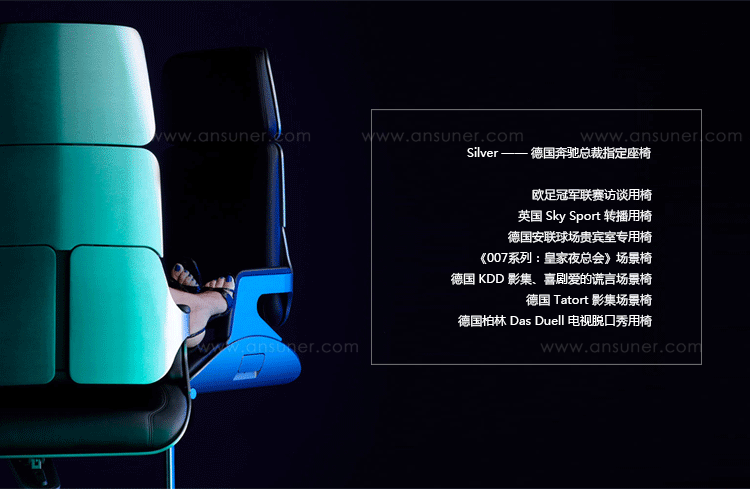 德国奔驰总裁制定座椅;欧足冠军联赛访谈用椅;德国TATORT影集场景椅;英国SKY SPORT转播用椅;德国安联球场贵宾室专用椅;德国KDD影集、喜剧爱的谎言场景椅;德国柏林、DAS DUELL电视脱口秀用椅你一定想不它们都来自同一个品牌Interstuhl的Silver。Silver享有办公椅中的“劳斯莱斯”的美誉,曾两次获得德国红点大奖。