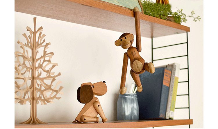 Kay Bojesen Monkey(Kay Bojesen 猴子)出自丹麦设计大师 Kay Bojesen 的设计作品,设计于1951年,精致的木制动物系列,是 Kay Bojesen 为人熟知的珍藏作品系列,采用不同的橡木、枫木、柚木等原木素材,保留木材的独特纹理,刻画出各种不同让人莞尔一笑的动物姿态,跳脱生活中的烦琐与紧张,简单的玩偶,轻松的神情,带您回归孩时的天真与简单快乐。精致而限量珍藏的作品系列,适合您作为桌面摆设,或是作为送礼小物,分享您生活中的快乐写意。可爱的小猴,可摊坐、吊挂树上、摇晃走路等,自在摆出您喜爱的完美姿态。英国著名杂志 Wallpaper,曾一次摆出 50 只不同姿势的猴子,带动您的全面想象和创造力。
