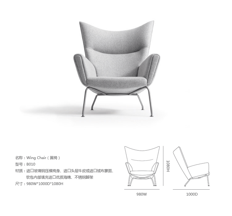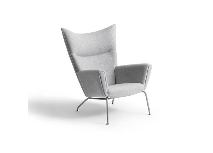 CH445 Wing Chair 是丹麥設計大師 Hans J. Wegner 1960年的設計,當時只見於草圖和少量製作的階段。於2006年由丹麥家具大廠 Carl Hansen & Son 重新生產製作。Wing Chair 典型的 Hans J. Wegner 設計,雕塑般的立體線條,讓這張椅子像藝術品般的獨佔一方。寧靜、祥和、平衡的鮮明的個性,來自椅背的弧度、轉角的收邊、肩線的溝槽和襯墊扶手。山毛櫸的骨架和高品質的密度泡棉,提供了恰到好處的支撐和柔軟的舒適性,讓背脊得以充分休息。Wing Chair 創造了一個自由自在的恣意空間,讓最美的形式以精確的技法和溫順的質感忠實呈現。Wing Chair 除了保留了典型的設計精神,同時也跳脫往常的存粹木工製作,椅腳的支撐改以金屬材質製作。金屬的支架看似纖細的紅鶴挺立於微妙的平衡之中,極具時代詮釋性的作品,是20世紀中期的經典家具代表作。