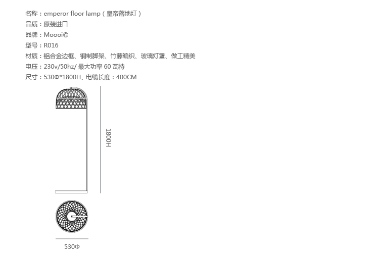 "Once upon a time an asian emperor received as a gift a nightingale. The charming bird sang so beautifully that the emperor always wanted it by his side. He placed the nightingale a majestic hand woven bamboo cage in the imperial chambers and listened, enchanted, to the magic sound" Material: Bamboo rattan cage, aluminum frame and glass diffuser Additional: Each cage is woven by hand And therefore has a unique character.