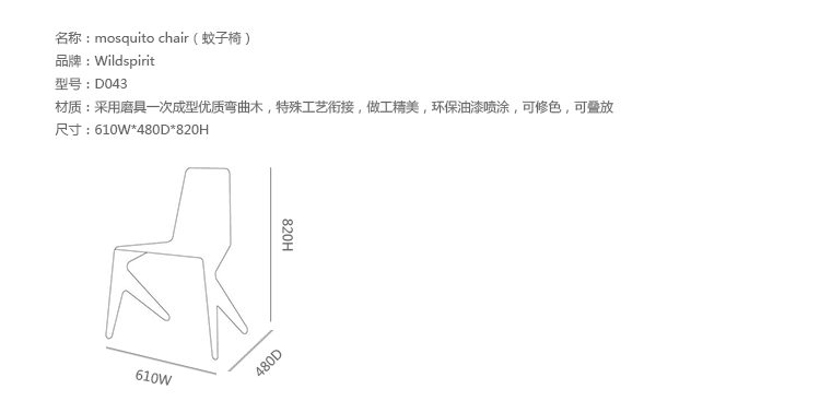 The‘Mosquito’chair is the result of a thought about humanism and the autonomy of furniture.It is a first step towards’no furniture".The chair takes the form of a living being which gladly lends itself to play the role of a comfortable seat.It is a stackable chair, useful in various projects.Even piled up,this chair reserves its rich and elegant style.