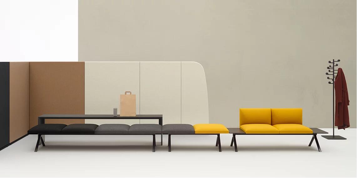 集合的岛屿。活动的星座图。kiik是为进入和离开、等待和做之间的空间而创建的。这种由座椅、桌子、脚垫和控制台组成的模块化集合,以各种配置的图形形式创造了工作、聚会或放松的时刻。Kiik的创建是为了满足候诊室、大学休息室、工作区、会议区和混合使用空间的需求。它的模块化性质和材料表面处理规范选项使它成为任何上下文的补充。Kiik的基本结构可以用带或不带靠背的座椅和三角形、圆形、方形或矩形的桌子来创建,还可以用脚凳和低矮或凸起的控制台来完成。各种纹理和颜色的室内装饰选项创造了适合空间的独特表达。将不同的配置组合在一起以产生动态效果,或者用重复的形式创建模式。Kiik非常适合任何合同使用,用于创建定制空间、暂停、工作、会面。模块化部件和尺寸Kiik是一个模块化系统,由各种尺寸的框架组成,可与垫子结合,可提供或不提供63x63 cm靠背,座位高度为45 cm。Kiik桌子有不同的形状和尺寸(矩形、方形、三角形、四分之一圆形),因此允许线性和L形模块(120°和90°)。该系列的补充是一个控制台与252x40厘米的三个高度顶部:58,72 e 105厘米,和126x157.5厘米的座椅高度36厘米的搁脚凳。