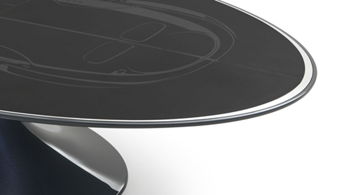 FRAME Steel and aluminium covered in carbon fiber reinforced polymers, BlueRoyale stained with glossy brushed finishingTOP Wood covered in leather (printed leather not included) with aluminiumdetails. Printed UV with "Atlantic Coupé 57SC" drawing, coordinated colour