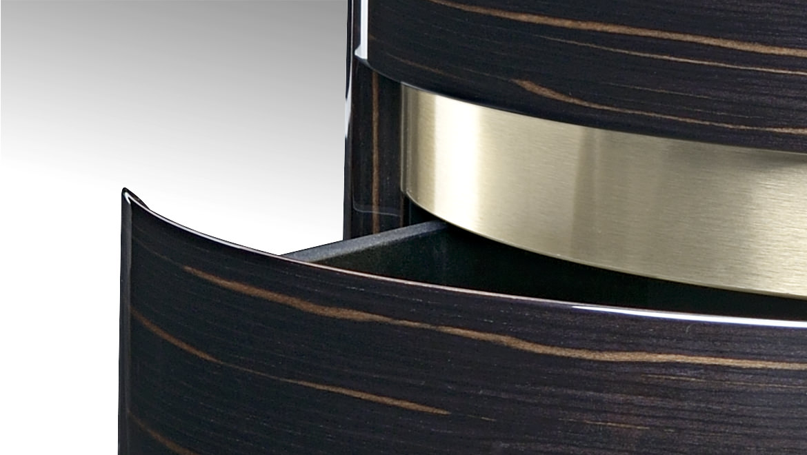 FRAME Frame in glossy lacquered wood or veneered Ebony Macassar, Erable,Rosewood or Rosewood Dark, with glossy brushed finishing; openshelving matt lacquered. Bottom top with glossy brushed finishing. Steeldetails with polished chrome, gun-metal grey, Bronze Shadow, polishedor brushed brass finishingDRAWERS Frontal drawers in glossy lacquered wood, covered in leather orvenereed Ebony Macassar, Erable with glossy brushed finishing, coordinatedwith the frame. Internal drawers in matt lacquered wood and with microfibrecoverBASE Wood with steel details with polished chrome, gun-metal grey, BronzeShadow, polished or brushed brass finishing