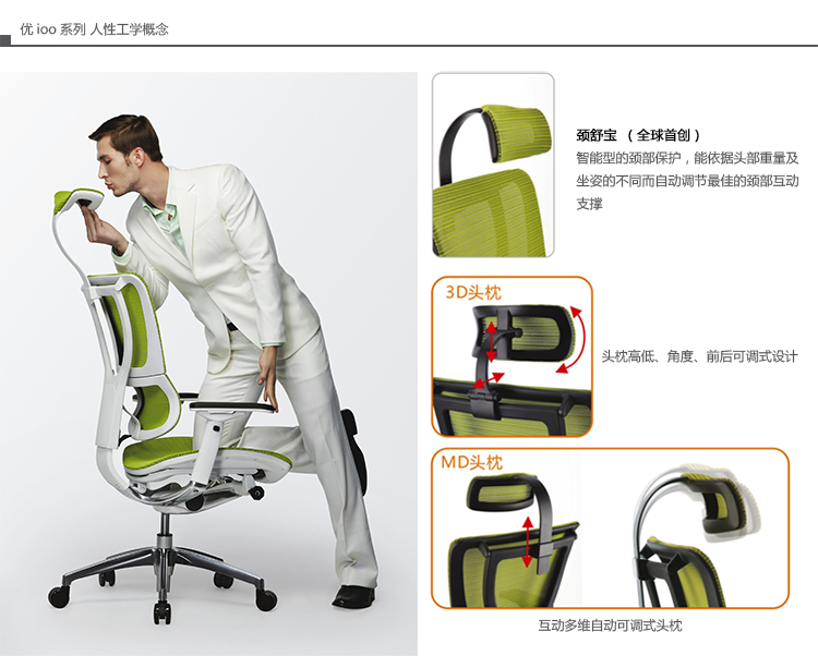 独特的3D弹性腰枕支撑系统,给予腰部三维动态的全方位的支撑;颈舒宝充分运用塑料科技的塑料弹性特征,在调整适当头枕的高度基础上,能依据头部的重量、身体的坐姿自动调整高度、角度、前后甚至是左右的位置,全方位的互动支撑,能有效的舒缓颈部的肌肉疲劳,达到最佳的颈部支撑效果;全球首创的单杆式操控底盘,一根杆操控所有功能,使办公椅的操控更加人性化;