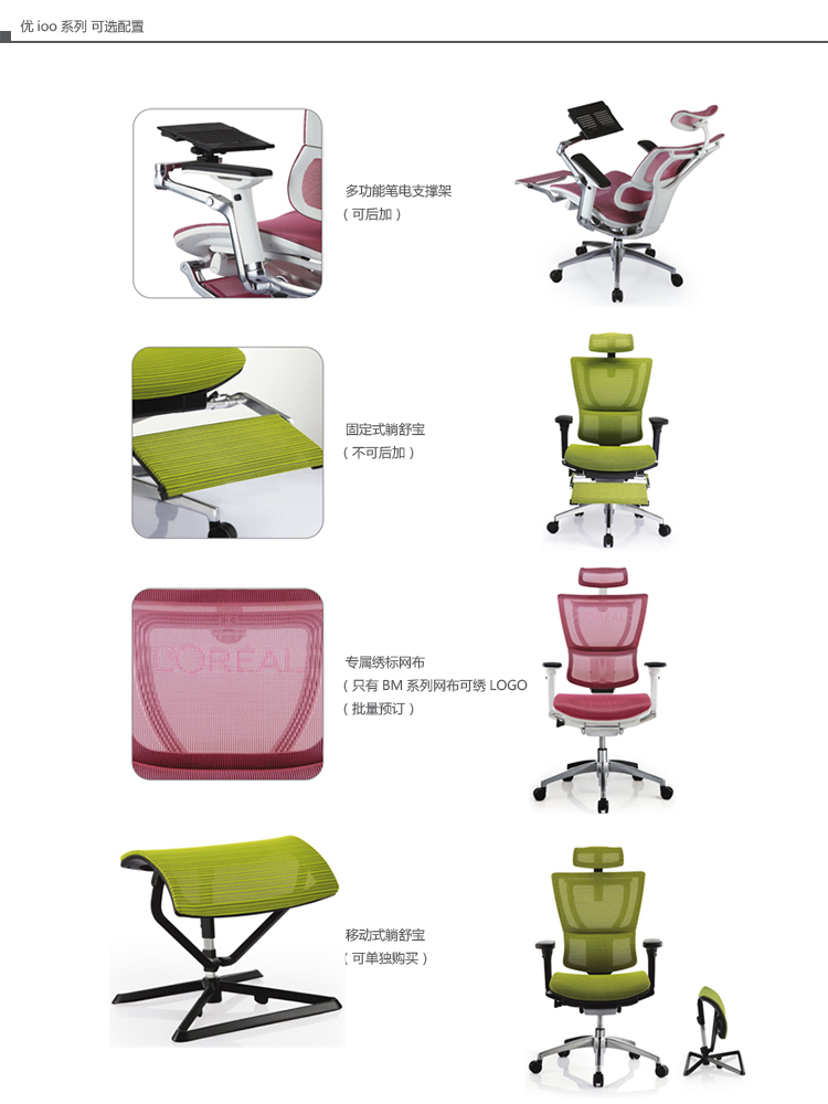 优系列座椅造型新颖,操作方便,专利型单杆控制底盘加上各种丰富多彩的配置,如,白色抛光铝框,网、布料,零压力座垫等,使它成为各种办公环境下的理想选择。