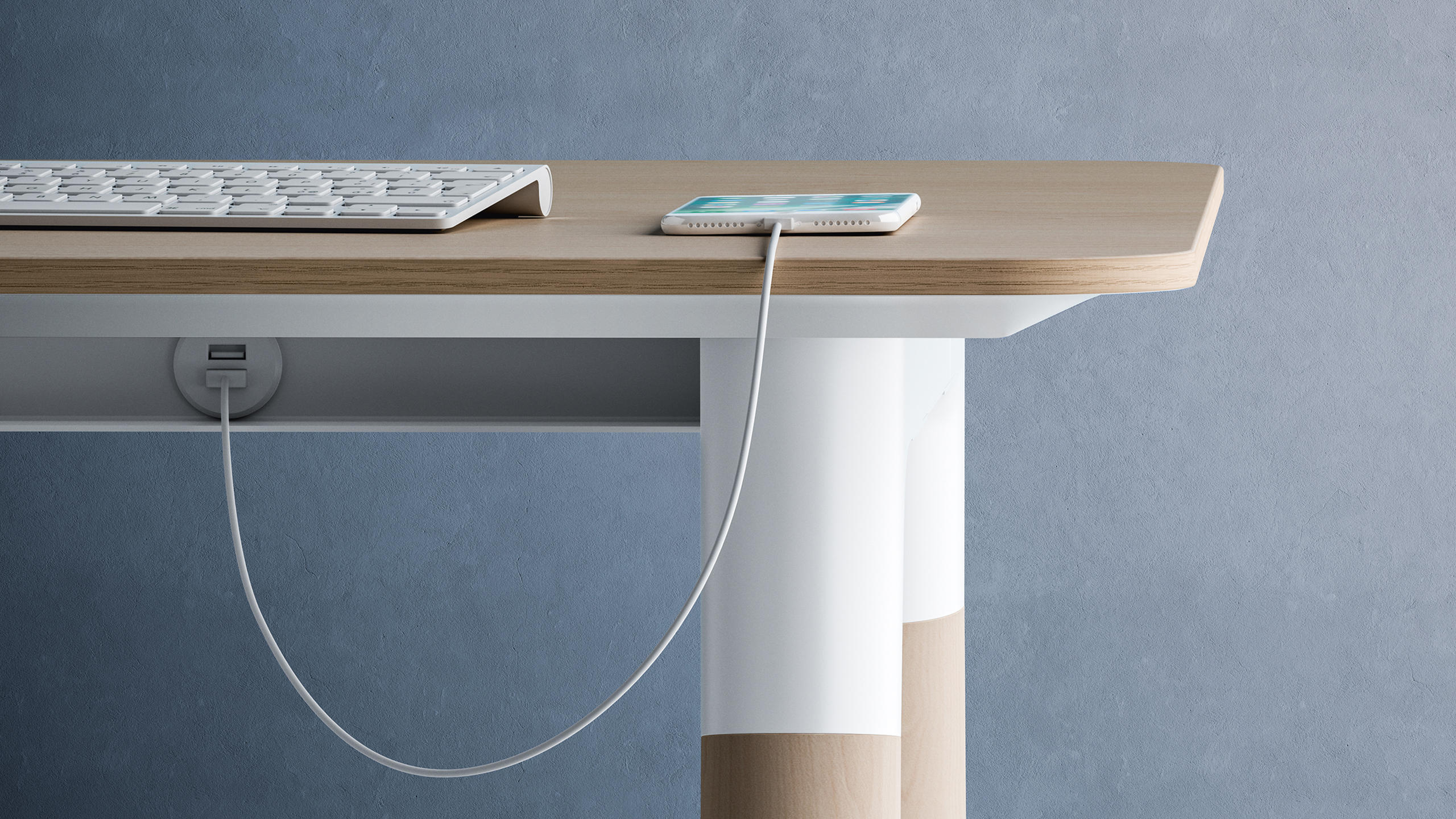 腿部的倾斜设计赋予表一个简单而精致的外观,包括两个可伸缩的圆柱形元件,其中之一是在木材。它里面是电子机构毫不费力地调整的高度桌面。