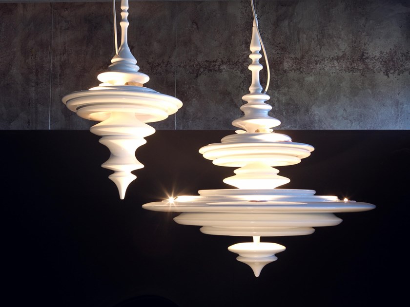 由玻璃纤维制成的大型枝形吊灯,有珐琅版或金属箔装饰金、银或铜。这是对东方文化的一种致敬,灵感来自缅甸寺庙结构。向空间辐射几何序列传播光和能量。