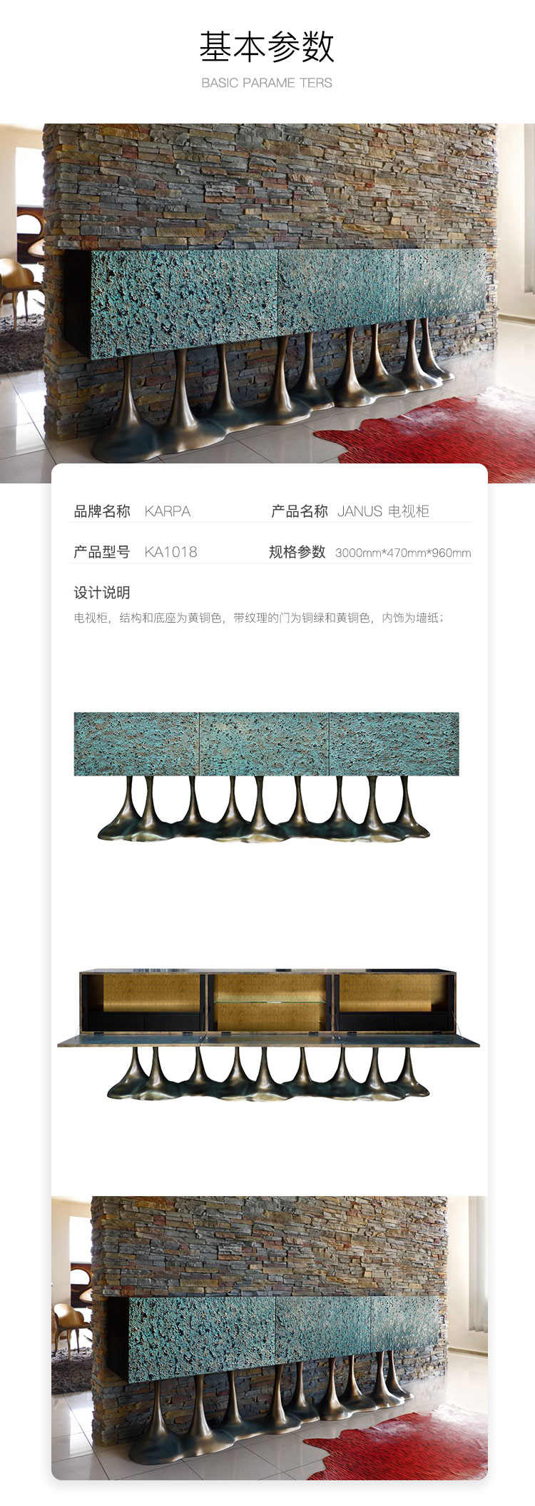 电视柜,结构和底座为黄铜色,带纹理的门为铜绿和黄铜色,内饰为墙纸;