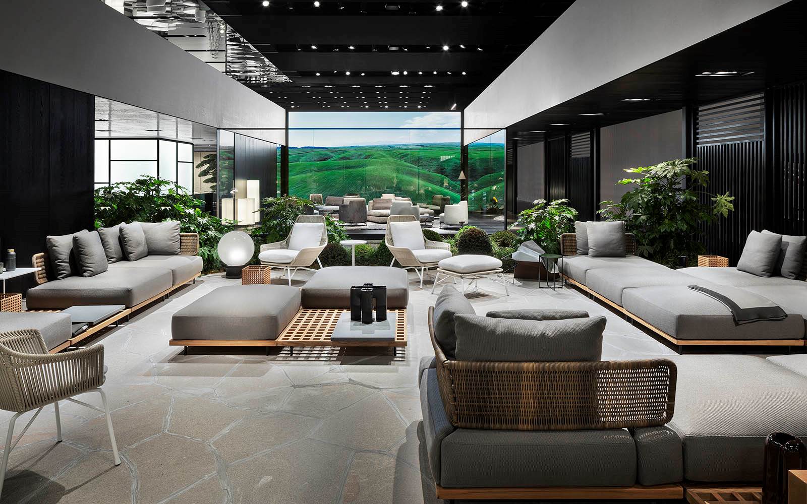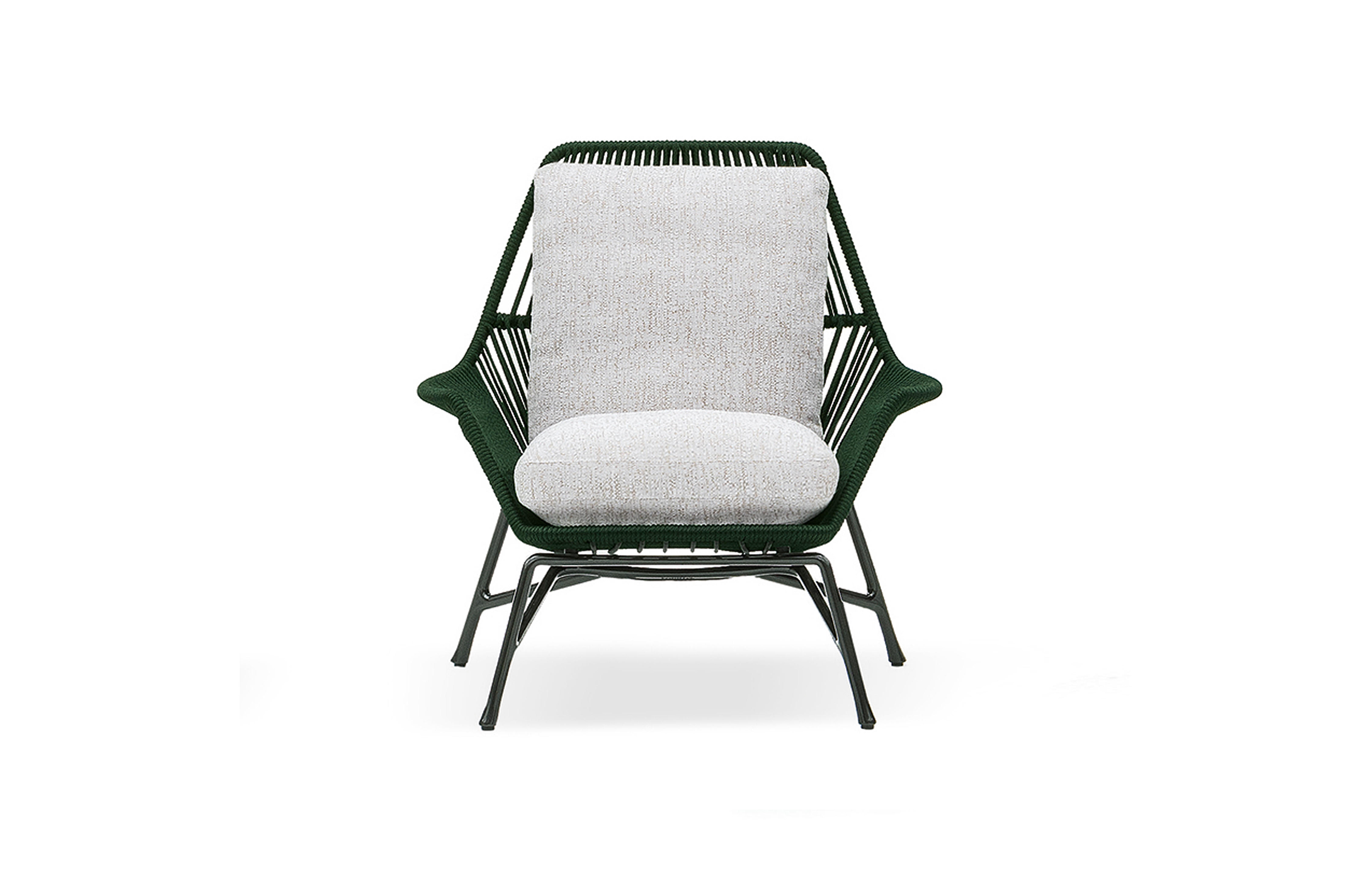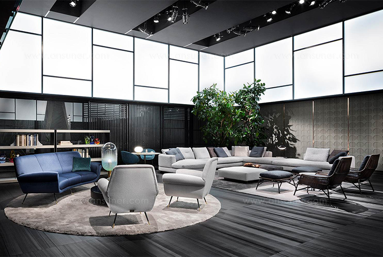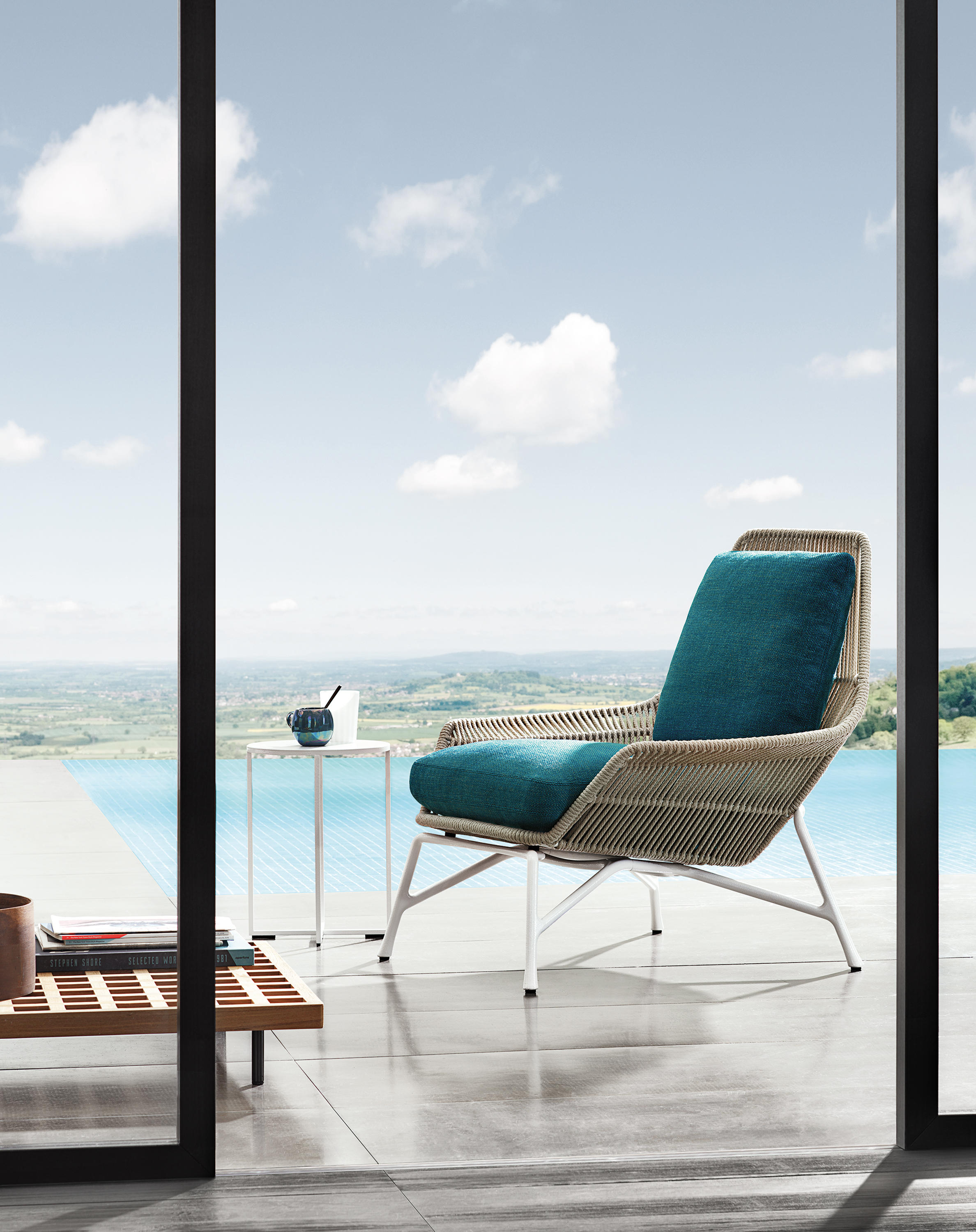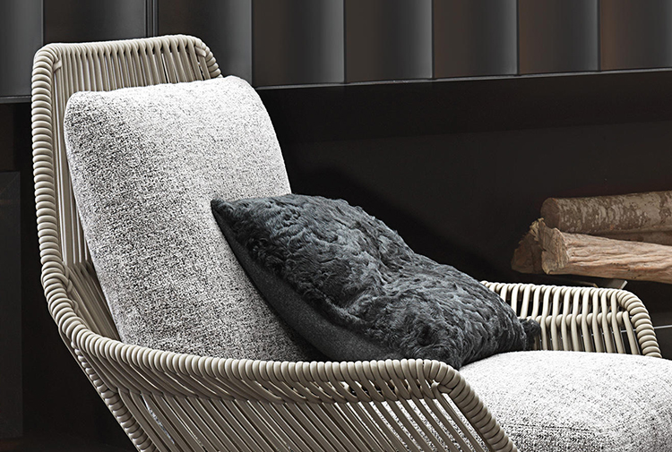 - 布艺或皮革 金属靠背和扶手 高弹鹅绒坐垫 (户外使用喷砂、锌底漆 Pewter色彩抛光)