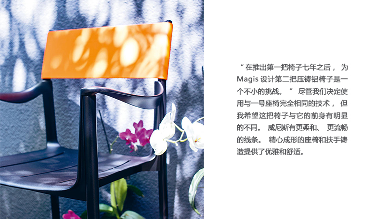 “在推出第一把椅子七年之后,为Magis设计第二把压铸铝椅子是一个不小的挑战。”尽管我们决定使用与一号座椅完全相同的技术,但我希望这把椅子与它的前身有明显的不同。威尼斯有更柔和、更流畅的线条。精心成形的座椅和扶手铸造提供了优雅和舒适。一个由柔性塑料模塑制成的靠背强调了椅子的类型学,并允许使用颜色和材料。康斯坦丁·Grcic康斯坦丁·格雷契奇1965年出生于德国慕尼黑。他在英国帕纳姆学院(Parnham College)接受内阁制作培训后,于1988年至1990年在伦敦皇家艺术学院(Royal College of Art)学习设计。Konstantin Grcic创造了被广泛描述为简约、简约、简约的工业产品。与时下流行的极简主义不同的是,他用人类的语言来定义功能,将最严格的形式与相当的精神敏锐度和幽默感结合在一起。威尼斯是一把有扶手的椅子。它的特点是抛光或涂漆的压铸铝框架。背面可采用热塑性橡胶或皮革。可选择的座位垫在膨胀聚乙烯覆盖在您选择的Kvadrat织物,适合户外使用或皮革。请注意,带橡胶背的漆框和可选的布料垫适合户外使用。