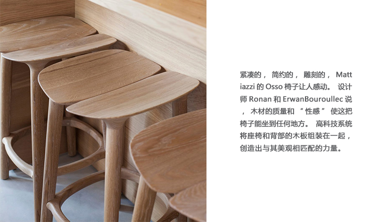 紧凑的,简约的,雕刻的,Mattiazzi的Osso椅子让人感动。设计师Ronan和ErwanBouroullec说,木材的质量和“性感”使这把椅子能坐到任何地方。高科技系统将座椅和背部的木板组装在一起,创造出与其美观相匹配的力量。Osso椅子是光滑的和雕刻的,就像一块骨头(意大利语“osso”)。这把椅子是通过工艺和精密加工与太阳能驱动设备相结合而制成的。没有化学物质被用来处理木材。可在黑色,蓝色,绿色,深灰色,粉红色,白色,天然灰烬和天然橡木。