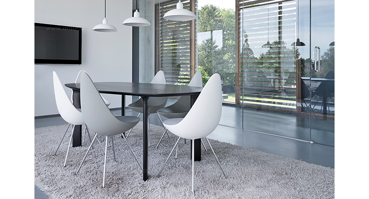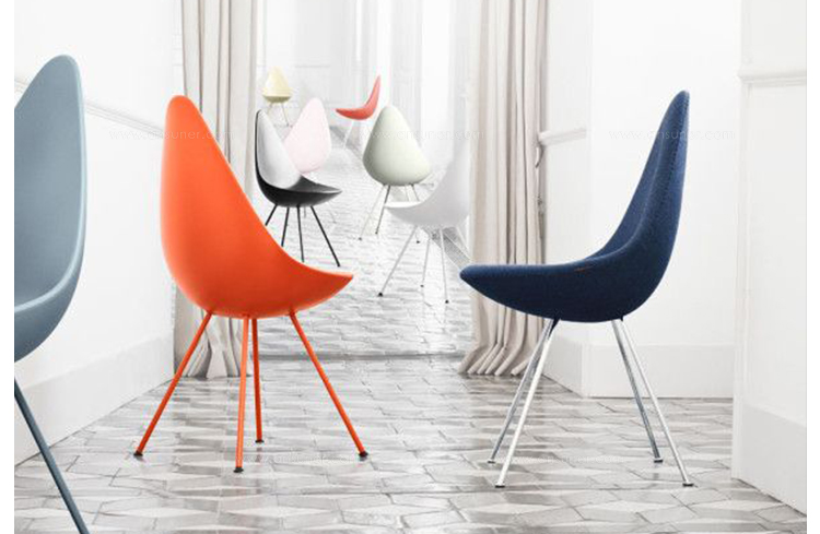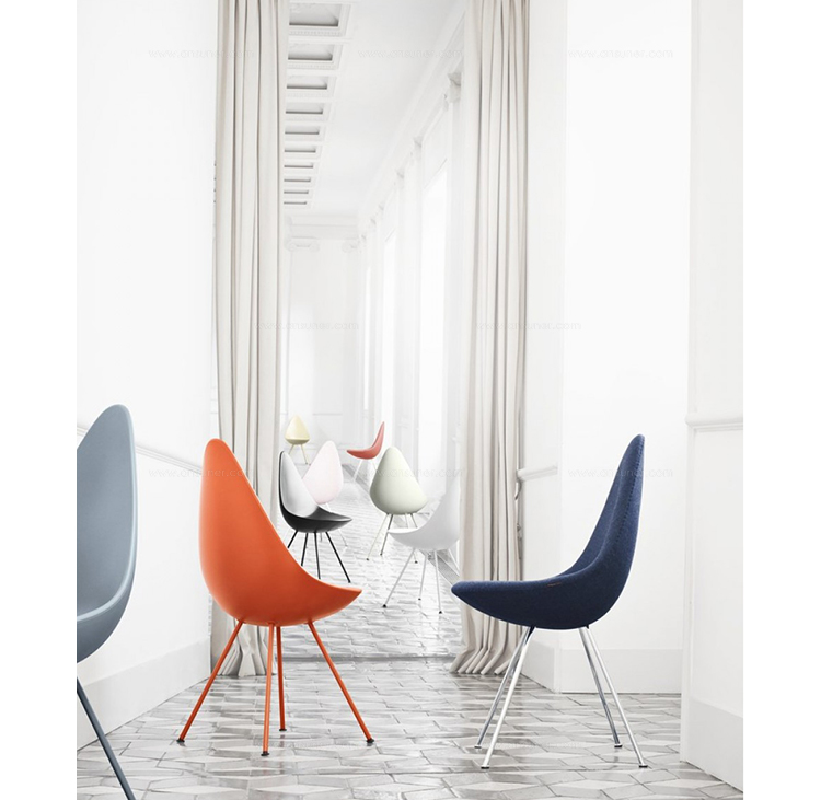 "“水滴椅”是由阿恩·雅各布森于1958年,在传奇的雷迪森在哥本哈根皇家酒店设计的,是他的杰作的一部分。“水滴椅”的设计原型为天鹅和鸡蛋,专门为酒店设计,数量非常有限。在“沉寂”50多年后,椅子现在重新上市。这把小椅子有着非常大的个性,清新并充满活力,稀有的传承。背面的设计结合了一个温暖的拥抱和自由运动,从而产生一个令人惊讶的舒适度。阿恩·雅各布森是非常富有成效的建筑师和设计师。他与弗里茨·汉森的合作可以追溯到1934年。1952年,“蚂蚁”和“系列7”椅子产生,从而将雅各布森和弗里茨·汉森的名字载入到家具的历史。1950年代末,阿恩·雅各布森设计了哥本哈根皇家酒店,并把蛋,天鹅,天鹅沙发和3300系列沙发带到设计世界。阿恩·雅各布森曾经并将永远是一名令人欣赏和杰出的设计师。他的家具和其他设计工作已经成为国内外遗产。“水滴椅”塑料椅子有四条不锈钢腿,镀铬或粉饰,以便与外套匹配。塑料外套提供一系列颜色,并提供与之颜色相匹配的羊毛垫块。"