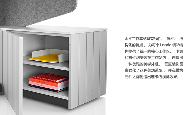 Locale能帮助机构利用和管理开放式的办公空间,通过该系统,员工能在坐姿或站姿,或是在团队工作与单独工作状态之间,实现无缝转换。Locale消除了视觉和实体障碍,并将整个开放式工作空间的建筑格局压缩成紧密联接的相邻结构,有助于员工更得心应手地工作,并保持彼此沟通顺畅。Locale组件设计缜密精巧,有利于员工自由、本能地在个人工作与团队合作以及社交活动之间进行转换。彼此相距咫尺并且一切所需手到擒来,毫不费力,员工不仅能轻松地完成任务,并且更加专心致志,发挥创意,尽展其才。