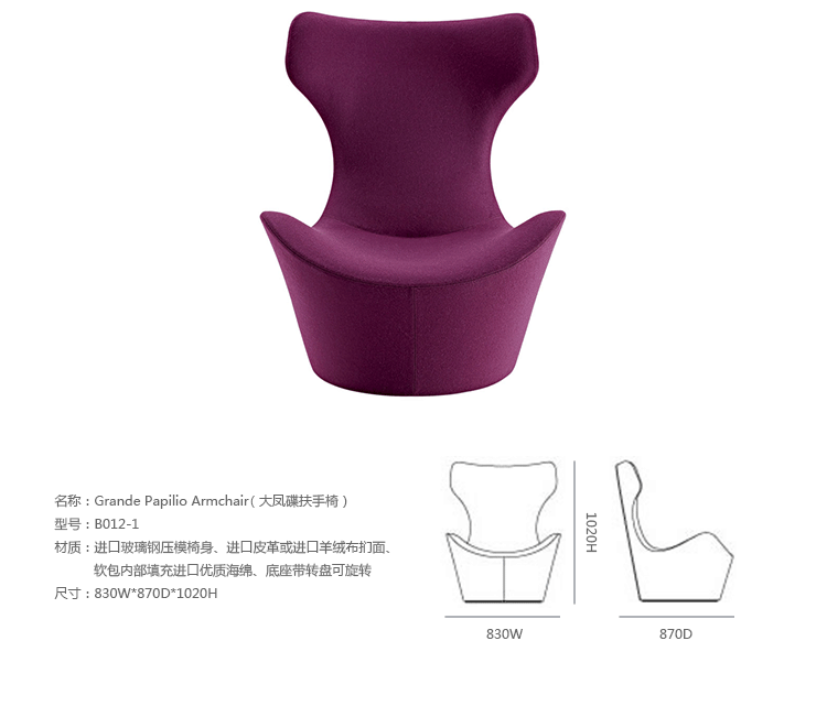 看似由單一材質一體成形的大型雕塑物件,Grande Papilio 流線形的設計從倒置的錐形體中雕塑而來。由下而上漸寬的椅背空間,提供了極致的舒適放鬆體驗。Grande Papilio 旋轉 360° 的底座系統能自由自在的環視空間中恣意流動的美好。強烈雕塑個性特質的 Papilio 系列家具也持續的擴大當中,不同大小和用途的 Papilio 家族:Papilio、Piccola Papilio、Grande Papilio、Love Papilio、Mini Papilio、Papilio Ottoman 提供了多元而完整的舒適空間。