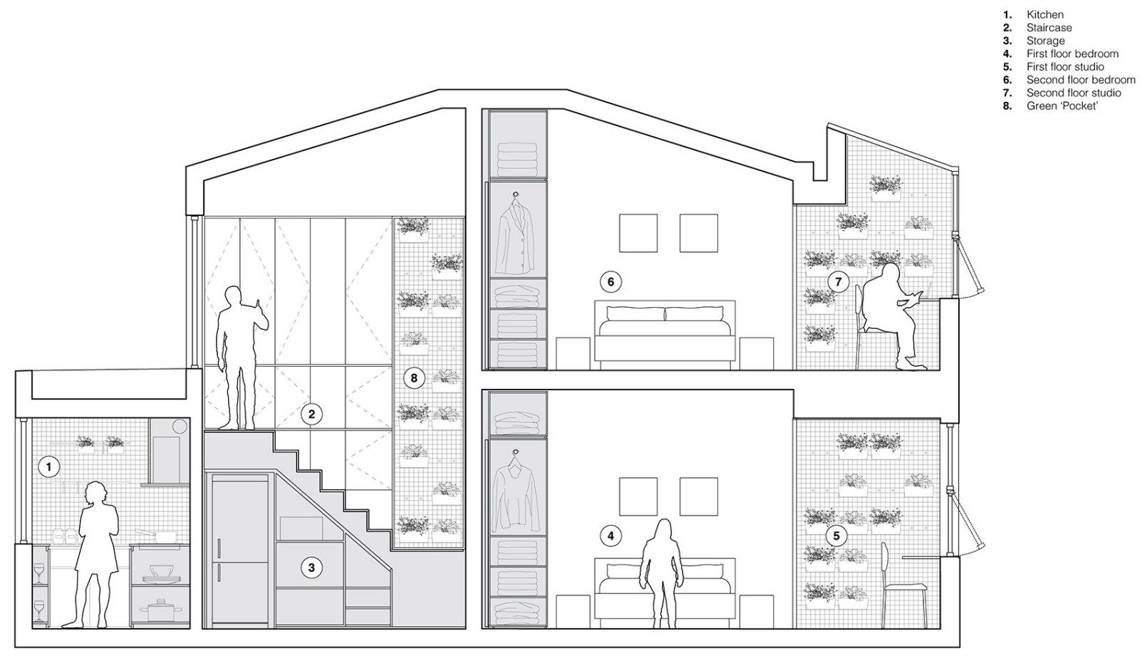 优思建筑将位于北京的一个85平米、阴暗、封闭破败的双层公寓改造为专为本地的一对年轻夫妇设计的明亮、开放、绿植充沛的居住空间。整个改造过程从设计到建成总共耗时两个月。北京电视台(BTV)邀请优思建筑参与一档住宅改造的节目,以小户型为主,展示其改造成果和设计过程。优思建筑借此机会让人们意识到北京老建筑恶劣的居住条件,并提高对室内空间环境标准的意识。作为住宅项目,它的设计理念基于自然光、空间、简洁性、可持续性以及与人与绿色的紧密关系。在原有的平面布局中,客厅位于整个空间的东侧,客厅中的楼梯阻碍了空间使用。客厅东侧的口袋形阳台阻挡了整个房间的东侧采光。首层过多的隔断阻碍了采光和通风,从而导致空气潮湿,环境不健康。