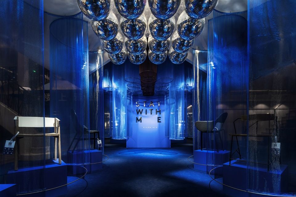 搜模型展览的现场在上海市复兴公园旁边的复兴广场。这是一栋被重新综合使用的老建筑,一层充斥着包括咖啡店、家具店、花店、展厅这样的业态,二层是We+的联合办公区域。为了弱化嘈杂不一的背景环境和复杂的交通流线,锦莳设计在这个商业空间中置入了一系列纯蓝色的装置构筑物,并借由此传达展品的能量和情绪。现状的建筑入口在骑楼的巨大阴影下,为了与外界的环境和过客发生互动,锦莳设计将入口全部用纯粹的蓝色覆盖。从蓝色的入口进入展场,你会首先被头顶悬挂的52个银色disco球吸引,他们伴着公园里吹来的微风,在灯光的照射下,反射着跳动的光线。再往里走是一系列从二层天井悬挂下来的蓝色圆柱,STAY WITH ME的展览序幕也由此展开。