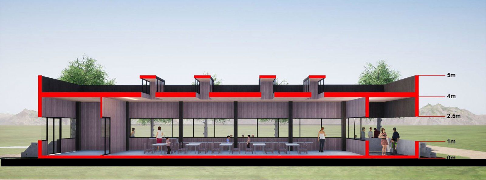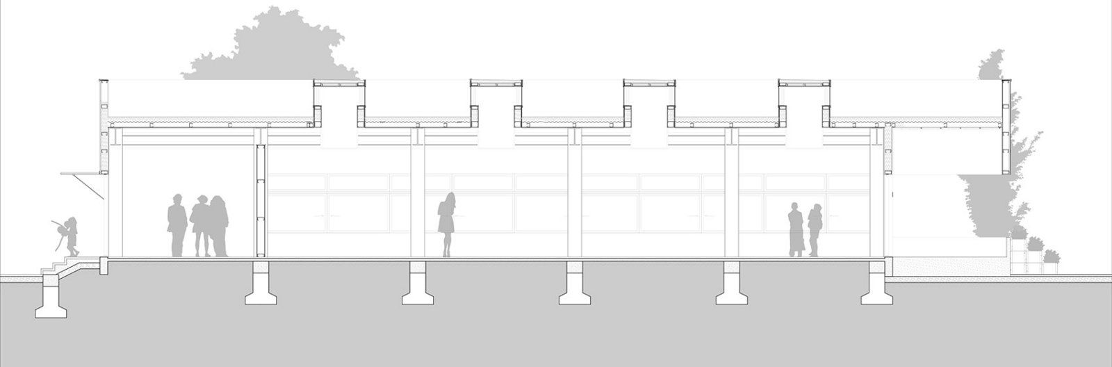 烤肉店的设计依旧遵循节省造价原则。据我这几年的乡建经验,从时间成本、人工成本、工人技能等几方面考虑,在这里做钢结构是最好的方式。我们选用了枕木作为外墙的主体材料,但窗户特意选用了塑钢窗,窗台下方是预制混凝土空心砌块。业主华腾牧业有渠道买到相对廉价的枕木,也是弥补一下在木屋图书馆没有用枕木的遗憾。预制混凝土空心砌块是目前乡村水岸护堤的非常常用的材料,是容易得到且廉价的材料,预制混凝土空心砌块在这里起到了一大一小的作用,大可以大到是建筑"大基座"的作用,小可以小到仅仅是个种植的花盆。塑钢窗是很不讨好的材料,以靠建筑敢用这么"low"的材料,原因有二:1、在乡下,在有限的造价范围内,塑钢窗是保温隔热、防水最好的材料;2、枕木与空心混凝土砌块的粗野,能压得住白色塑钢窗的"轻浮"。