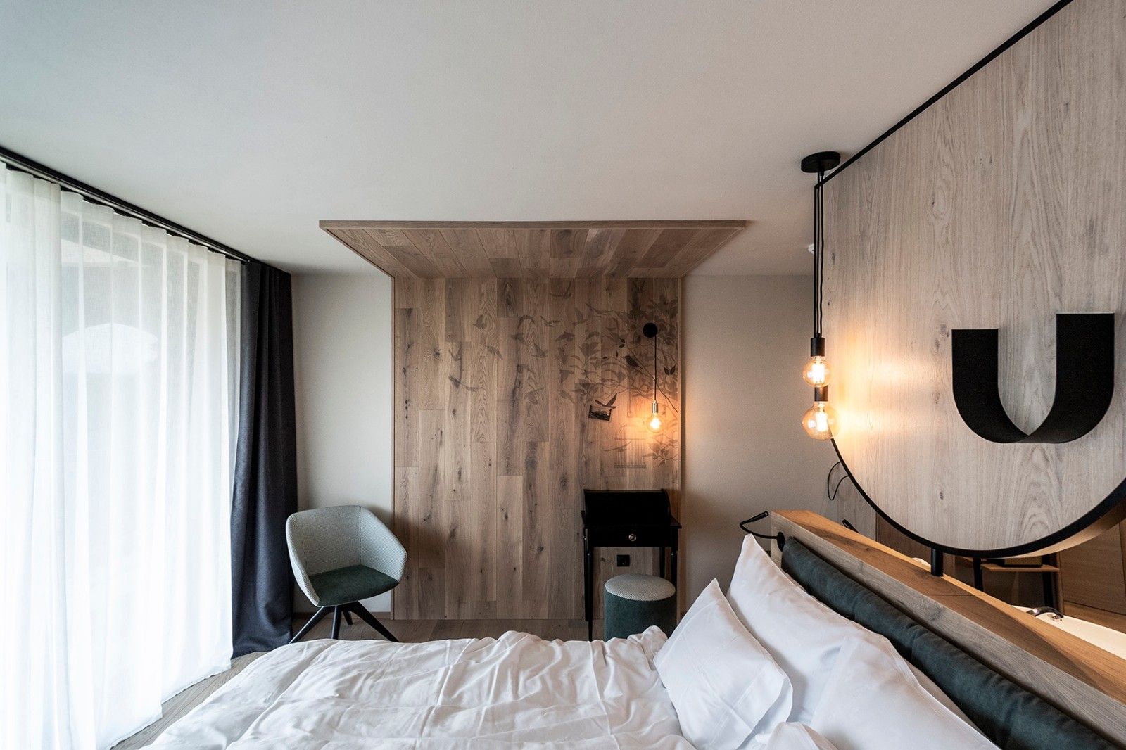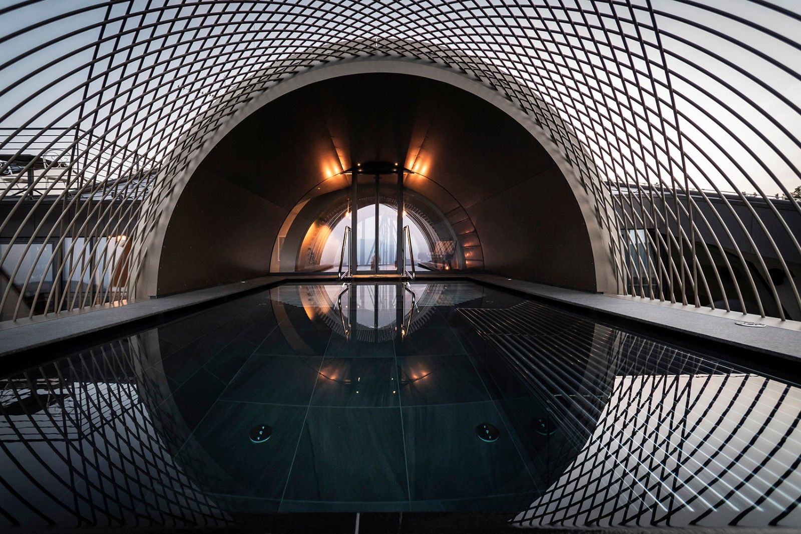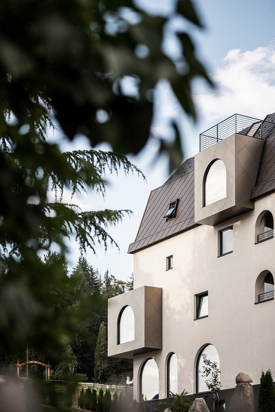 以拱形为基调设计团队为建筑赋予了具有当地特色的元素,例如立面上的拱门和有斜脊的屋顶,从中可以回顾到Oberbozen村庄的悠久历史。与此同时,菱形元素也被融入建筑当中,这在Ritten铁路沿线的建筑中十分常见。整体的设计思路十分清晰:由大量的细节共同构成一个统一而完整的项目。酒店的特色之一在于与地形完美呼应的布局:车库位于包含25间客房的酒店建筑下方,停车场区域一直延伸到7个花园套房所在的地面层。从宽阔的酒店花园望向酒店,可以看到接待处、大堂和餐厅等公共区域。餐厅二层的露台可以俯瞰花园和远处的美景。立面的设计将室内的活动以一种独特的方式展现出来,同时又不至于泄露得太多以造成隐私上的不便。