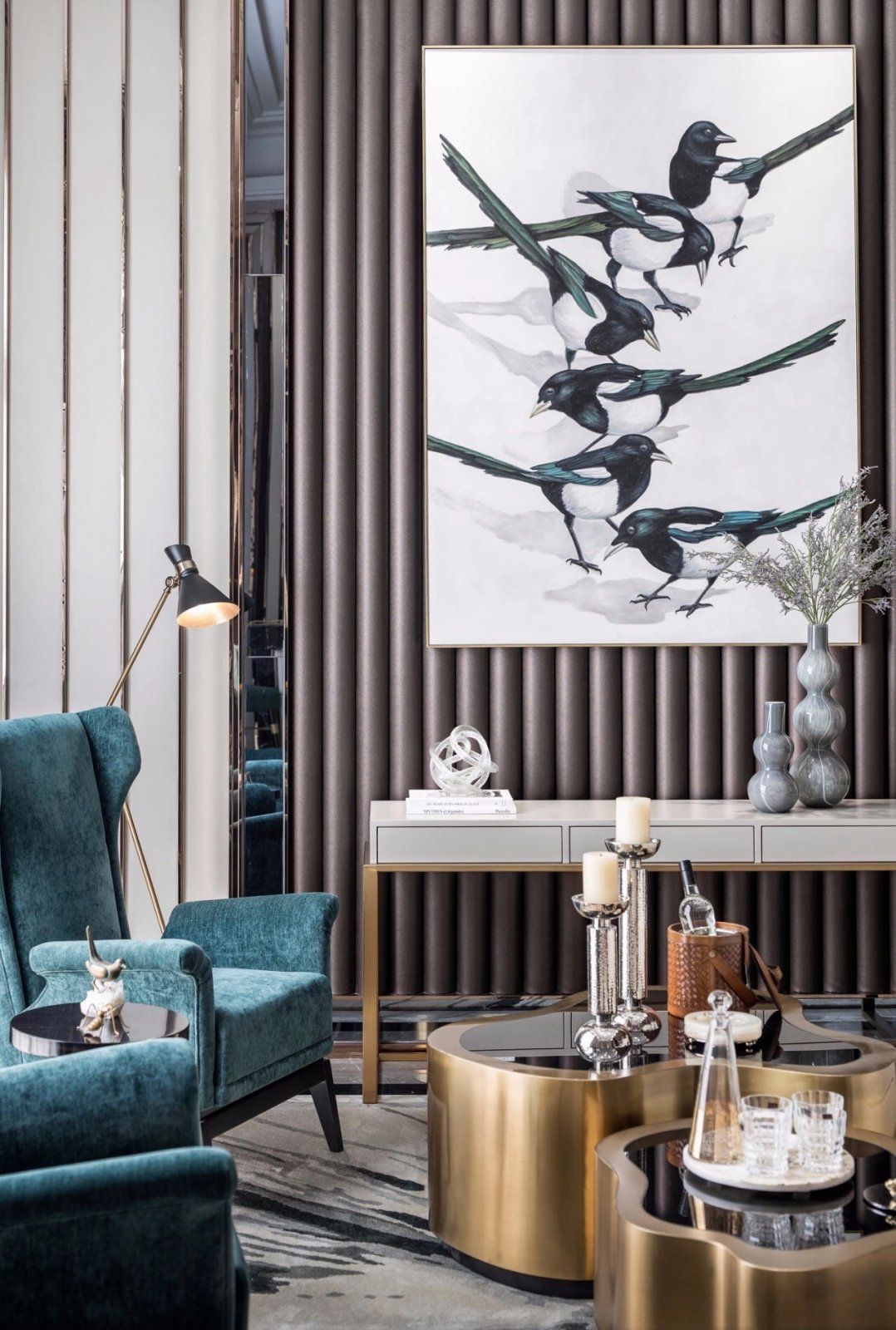 造型独特的黄铜茶几,由两个不同形状的部分组合而成,这件富有雕塑感的作品展现出强烈的舞台效果,放在任何一个室内空间中都绝对是一抹点睛之笔。极富活力的艺术画作令空间鲜活而趣味,深青色丝绒座椅也为空间注入了典雅的气息,各个细节、元素彼此协调、呼应,共同演绎了这个灵动梦幻的休闲空间,营造一个永恒和独特的天地。