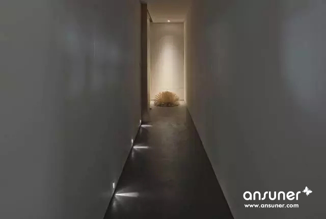 门口紧闭的电动木拉门混搭极具后现代个性化的金属球,既营造了安静的办公环境,又以一种戏谑而深刻的方式阐释了设计是一个观照内心的过程。随着推拉门的开启,观者进入一条窄长的通道。通道一端,是繁枝扩散的灯光装置,展示了向上生长的力量,另一端,是一个透出光来的小洞,恰似路标,引人遐思,点燃希望。
