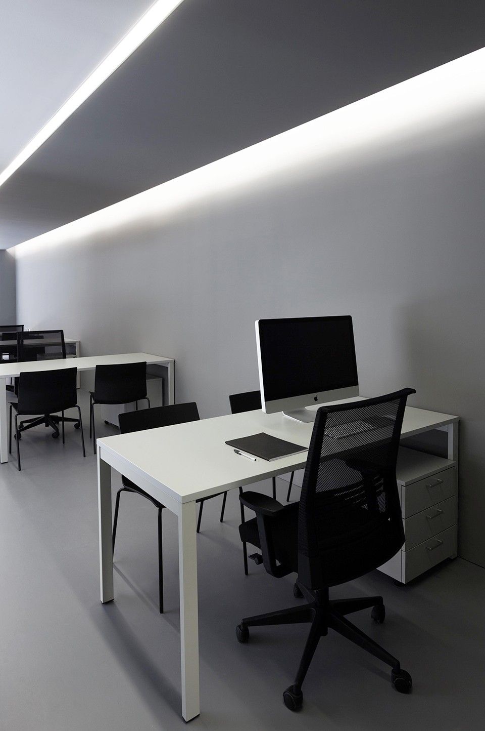工作台和服务空间被"靠墙"放置,等候区和会议室则位于两个开放空间当中。天花板的灰色部分划定出办公区域,间接式的照明为空间带来最大范围的光亮,在为桌面提供采光的同时还起到容纳空调设备的作用。既有建筑的结构被隐藏在用于划分空间的家具当中。