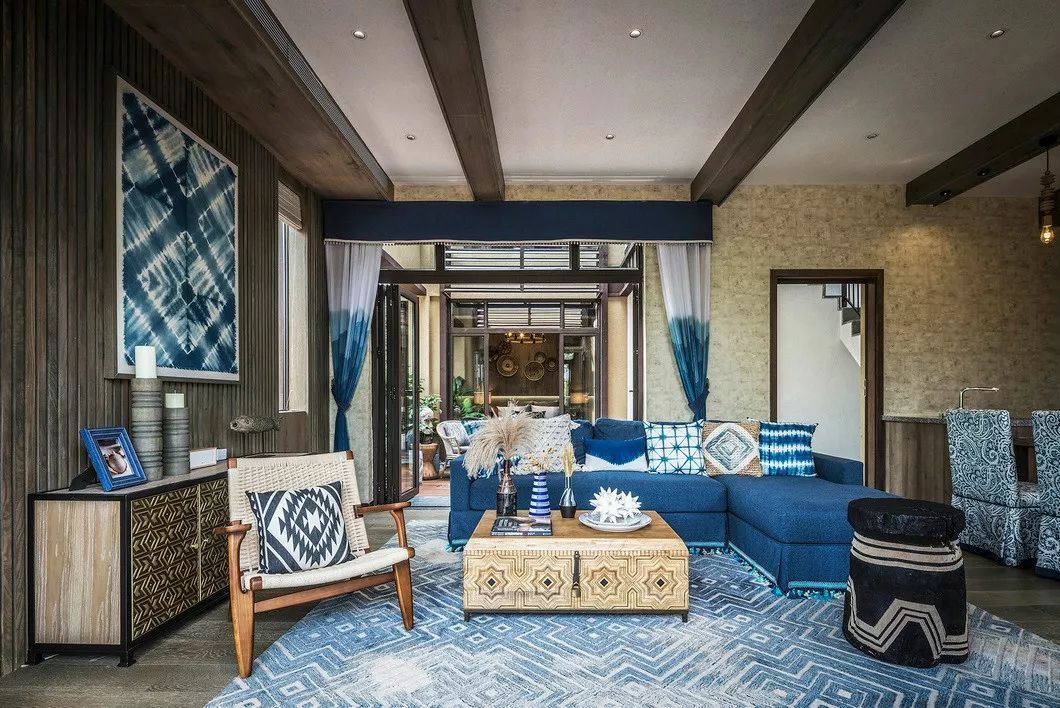 原木巢筑在自然的怀抱之中,室外林木葳莛、绿荫匝地。为了将自然的气息引入空间,大面积玻璃门墙的设计,让人端坐室内,亦犹如驻身自然。空间以印染艺术为主题,撮取于石材的米黄色、民族风情的蓝布、海洋蓝的清爽之气、朴拙的木制材料,让空间本真的质地、轻松自如的调性发挥到极致。细节处的巧思,带有异域的格调,装饰纹样汲取自北非设计元素,于简约中蕴藏着一丝神秘。