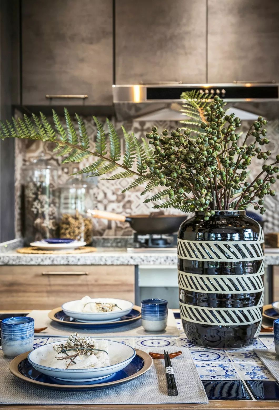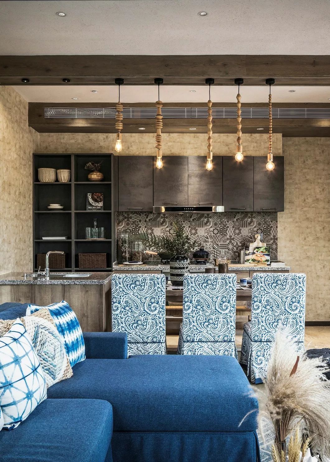 设计师赋予了用餐区域强烈的场景体验感,一幅印第安酋长画像,让空间的历史风韵和异域气息扑面而来,倏忽引发心灵的遐想。高脚烛台,鹿角吊灯,黑色大理石餐桌与收纳柜融构一体,独特的配设让此在的每一餐都仿若盛宴。蓝色马赛克瓷砖,给中性醇厚的空间氛围增添了一些率真纯净的气息。