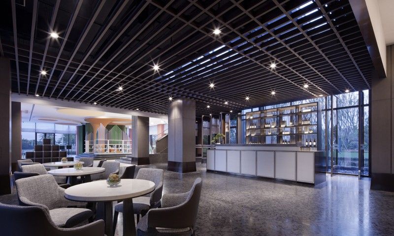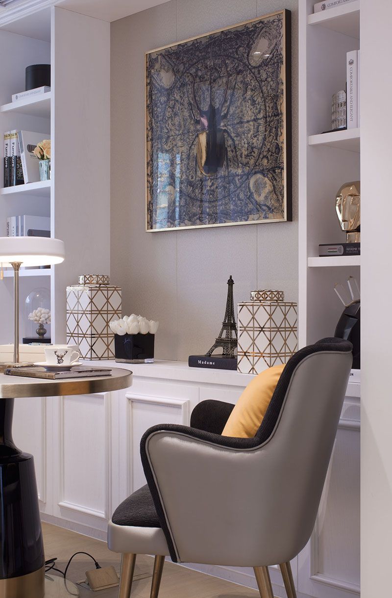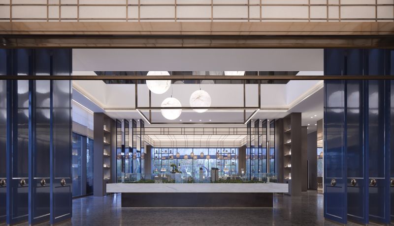 HUAXIDI SALES CENTER 入口接待处室内整体设计采用了框架式的构造,侧边不锈钢条立地而起,又互相交合而成,汇聚一个围合气息的空间。天花采取非传统的做法,选用了宣纸作为铺陈,灯光一起,古色古香,层次分明。前台接待处在设计上特意定制了两个中式案几满足功能与气质上的需求,而后错落有序又夹带"刺绣"元素的落地屏风画,与户外斜射进来的光线相抵,结合营造了一番中式特有的韵感与雅致。