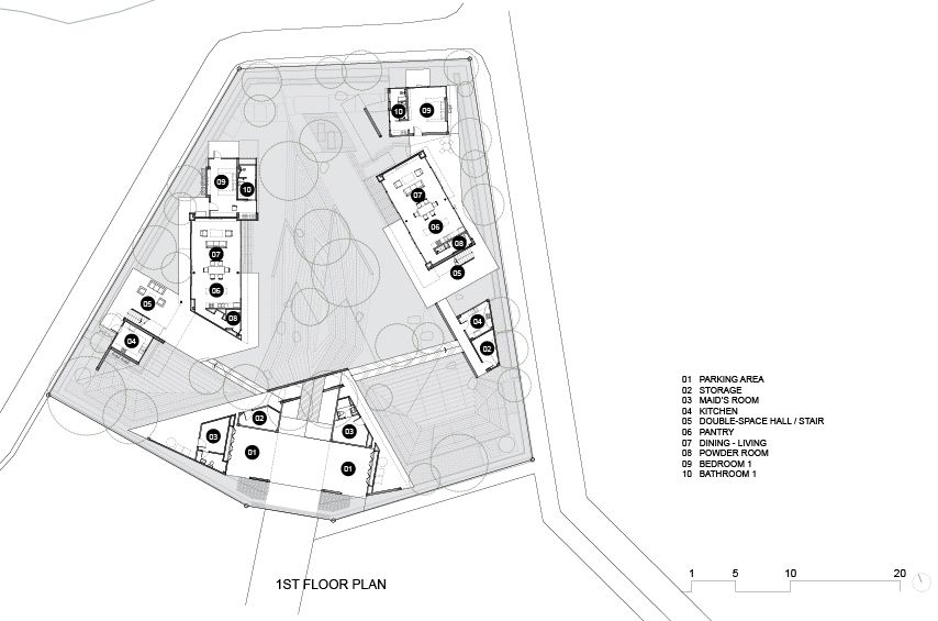 设计师为了创造一个独特的度假屋,将泰国的传统信仰——即风水融合进了Gliding别墅中,同时结合现有的场地环境和现代设计原则。该场地位于一条道路的尽头,这里享有群山环绕的美景。然而业主并不满意该地块的位置,于是设计师将整个地块规划分为两个部分来建造建筑,以解决这一迷信的情况。面向死胡同的区域,将通过打造一个开放的庭院来改善现有情况,这里也成为了整个场地的共享景观。设计师利用风水这一概念通过改造水体和地形等特征来打造吉祥的环境,这些风水理念也与自然通风相结合,使整个设计成为了一个可持续的项目,为业主提供了舒适的生活条件。