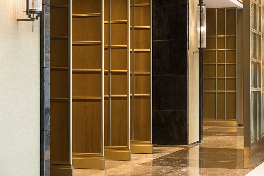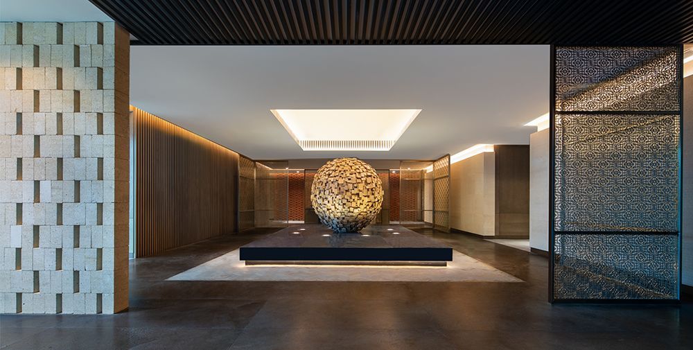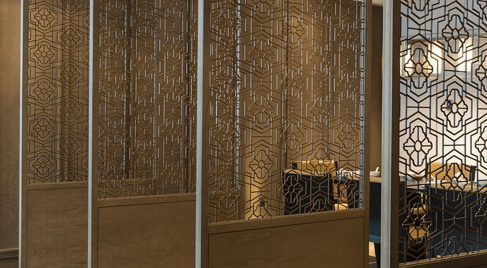 正入口处,大量木构造屏风垂直悬浮于大堂半空,部分屏风以传统岭南民居常见的砖雕纹理作为细节填充;有些则以多种不同材质进行渐变地拼接:最上是木质、中间是木与亚克力的组合、最下为全亚克力,虚实结合,以展现海市蜃楼般的梦幻动感。