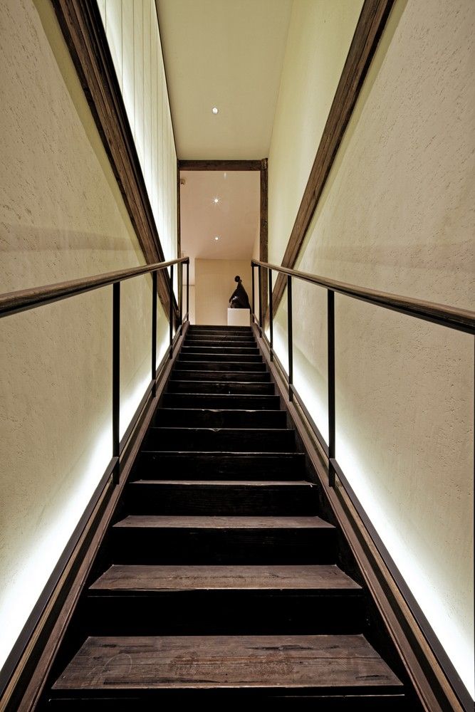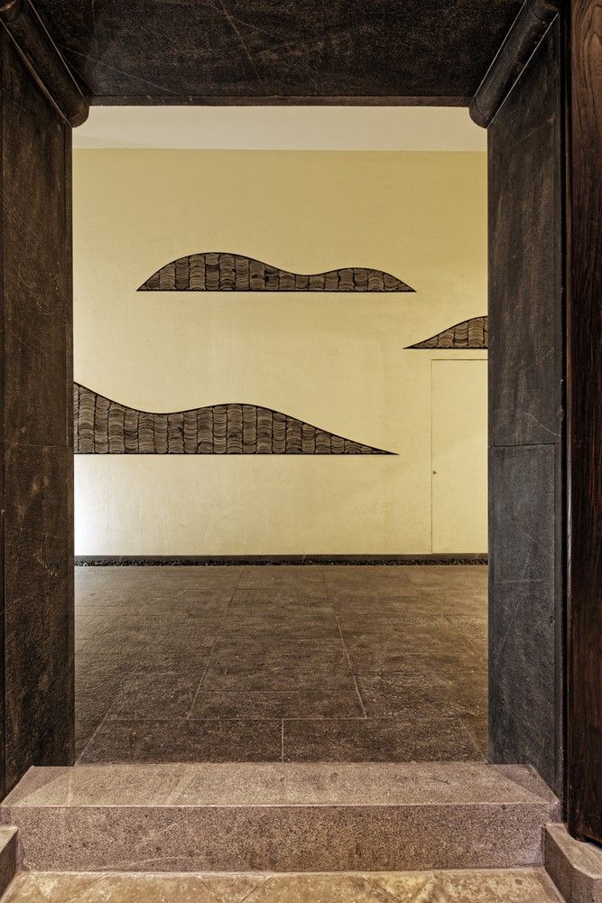 景德镇的古建筑受明清两代徽派建筑的很大影响,这栋民居即是典型的徽派风格。其中两进之间的天井最有代表性,称为四水归明堂,天井开口不大,但光影精炼,充满仪式感,且日常起居非常实用。美术馆的这个空间高度也有限,因此,古宅搭建了两层,但高度都不高,尤其是上层,顶部是大型结构钢梁,梁底所剩高度仅剩2米4。原本设想保留钢梁的裸露状态,但600厚的大型钢梁的体量在传统木构面前实在显得巨大,而且空调、电线等管路错综复杂,难以做到干净整齐,于是只有采用吊顶来处理,石膏板封完钢梁的下沿楼板仅剩下2米35。好在钢梁之间的空隙做了天花造型有所抬高,局部安装了灯槽反光使顶部不那么压抑。几处天花造型采用了拱形,是为了与古宅一层进门处一段木作拱形廊顶相呼应,这段廊上部是古宅原有的称做回马廊的空间,现在也做成了展区。美术馆的空间在靠近这个角上的局部高度是够三层楼,于是这展区边装了楼梯通至局部的三层小展室。