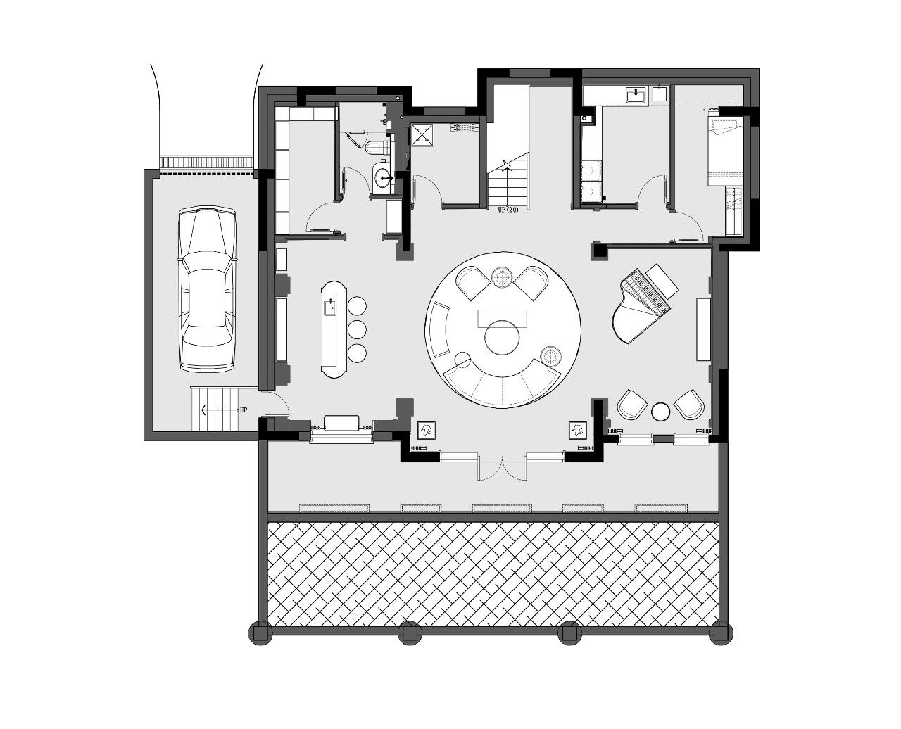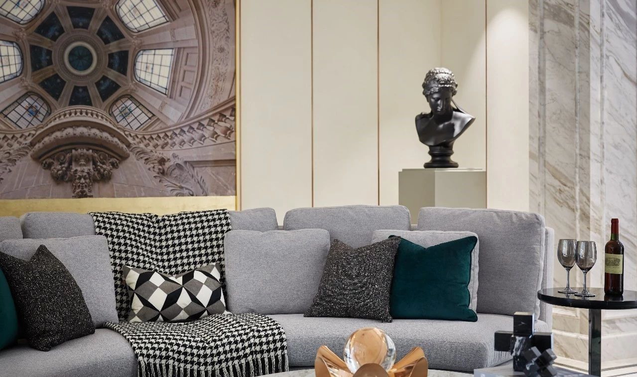 进入这栋别墅,通过玄关空间的过渡,可以步入挑高的客厅区域,由黑色石材雕琢的法式壁炉与厚重的巴洛克风格装饰镜在第一眼就能看到;象牙白色的护墙板有着优美的线条,细腻丰富的装饰代表了传统精神与永恒;灰色调的客厅地面大理石配以深色围边,表达了理性审美的新标准;顶面浮雕花饰则将古典主义的韵味演绎到极致。玫瑰金色的主吊灯占据了空间的核心位置,轻盈如同风中的雕塑,无论形态或是材质,都与下方的圆形茶几形成连接,整个空间也因此增添了一丝柔性之美,仿佛是从浑厚背景中脱离跳跃的音符。灰色调的家具沉淀在客厅空间的下半部分,一对绿色的单人椅尤其瞩目。简洁的家居配饰、明了的色彩层次,空间在内敛之余呈现出一种轻松、理性的气质。
