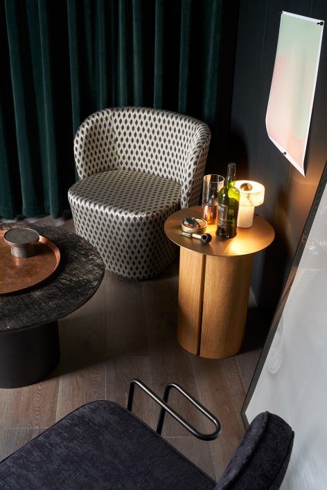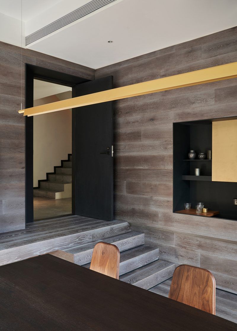 通往内部的入口设置在墙角,顶部的弧面与线条纵横交织,看似简单的勾勒,展现出微妙而持久的张力,也将设计师打造经典设计的决心展露无遗。不同于前厅的敞亮,转角的空间光线微弱,明暗的变化形成一种原始的力量,自然而然地引人一探深处的奥秘——古朴的边几静立在墙边,上方安放着一件花艺作品,幽暗的灯光将花影投于台面上,阴翳的波纹与明暗中生发着灵动,是为东方传统之美。内部入口设置在墙角