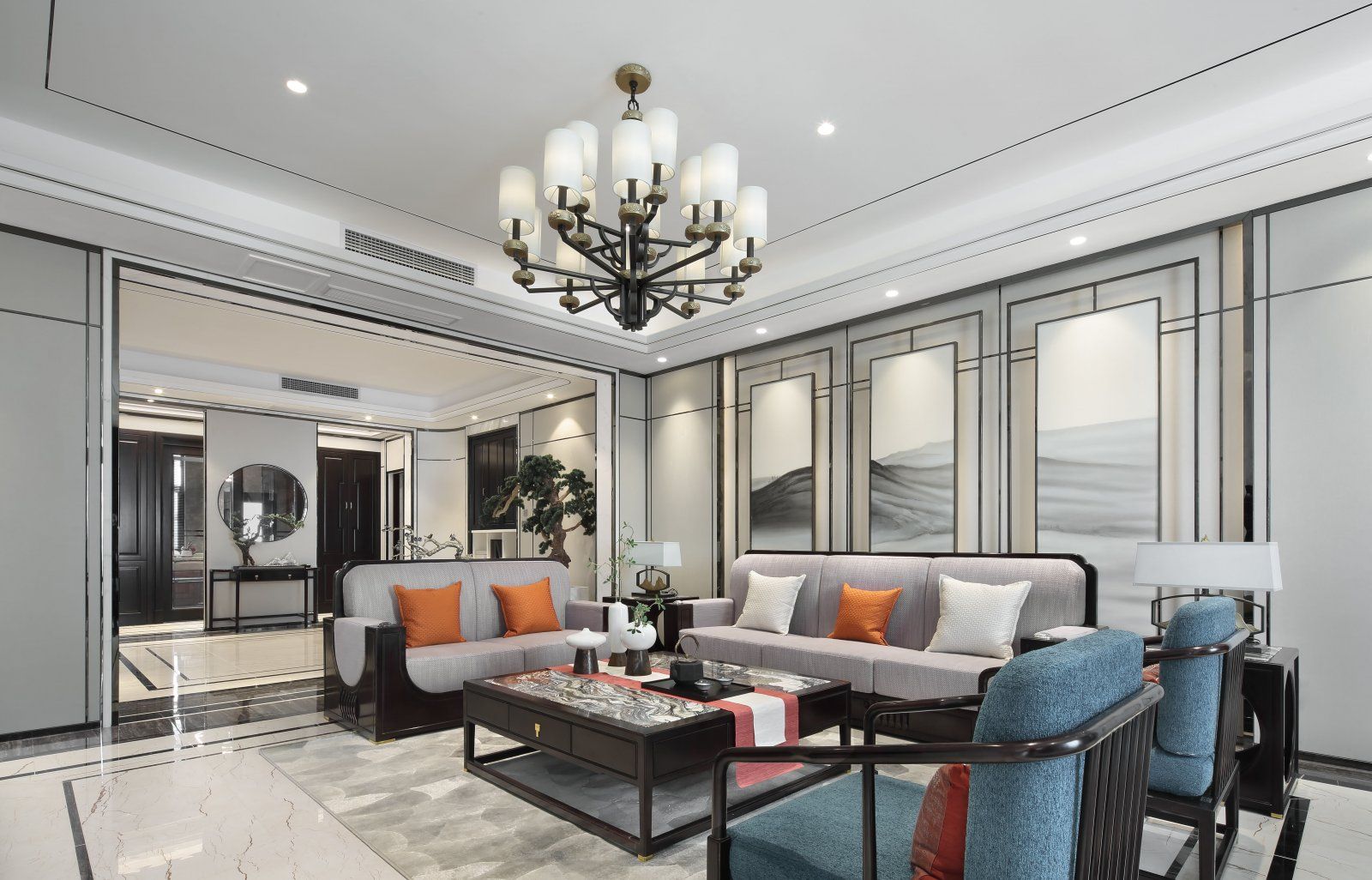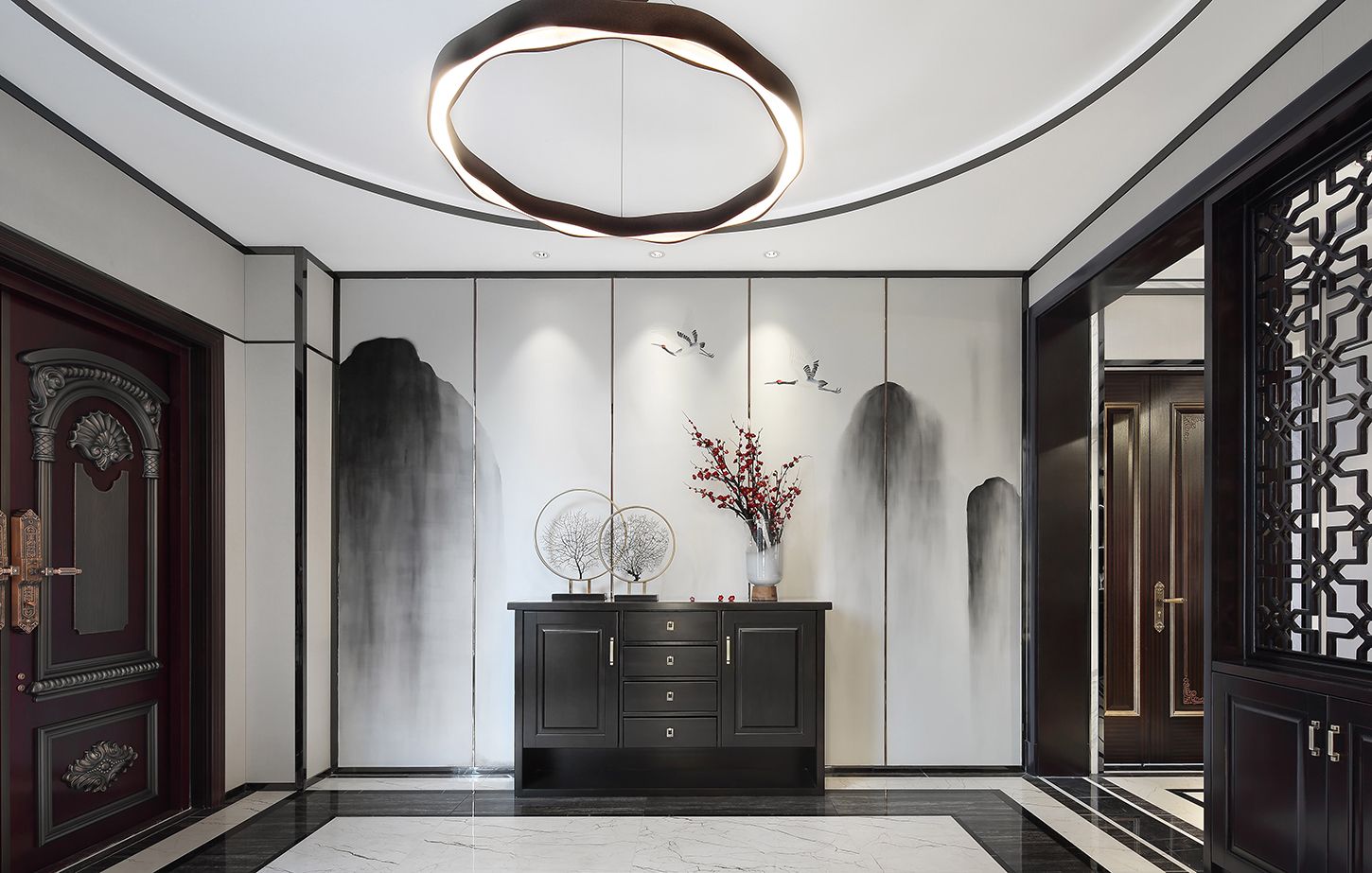 门厅挥毫落纸墨新痕,水云波上祥鹤双,几缕梅香最可人,留白淡雅共同勾勒出一个意境幽远的广阔空间。