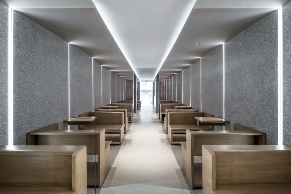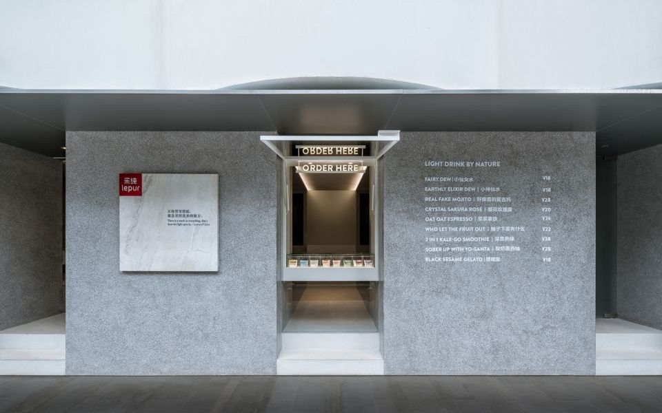 店铺位于一幢名为 "那里花园" 的中层建筑地面层的东南转角。该建筑外立面由一系列白色外凸半圆形体块造型构成。由于原有外立面门洞无法移位,芝作室将这一限制转化为契机,将场地现有的光影模式转译成为空间概念。原有基地被视为一个灰色方形体块, 与大楼的圆形标志分开; 而原有门洞被视为体块间隙,也是光线传入之处。空间设计运用白色材质强调光的路径,将原本不规则的平面划分成井然有序的区域。每一道"间隙"各承担不同的功能:一组沿街座位,一个店铺主入口,一个外卖站以及一个通入建筑内部的入口;而灰色体块则承载了吧台,等位,用餐体验等店铺基础功能区。