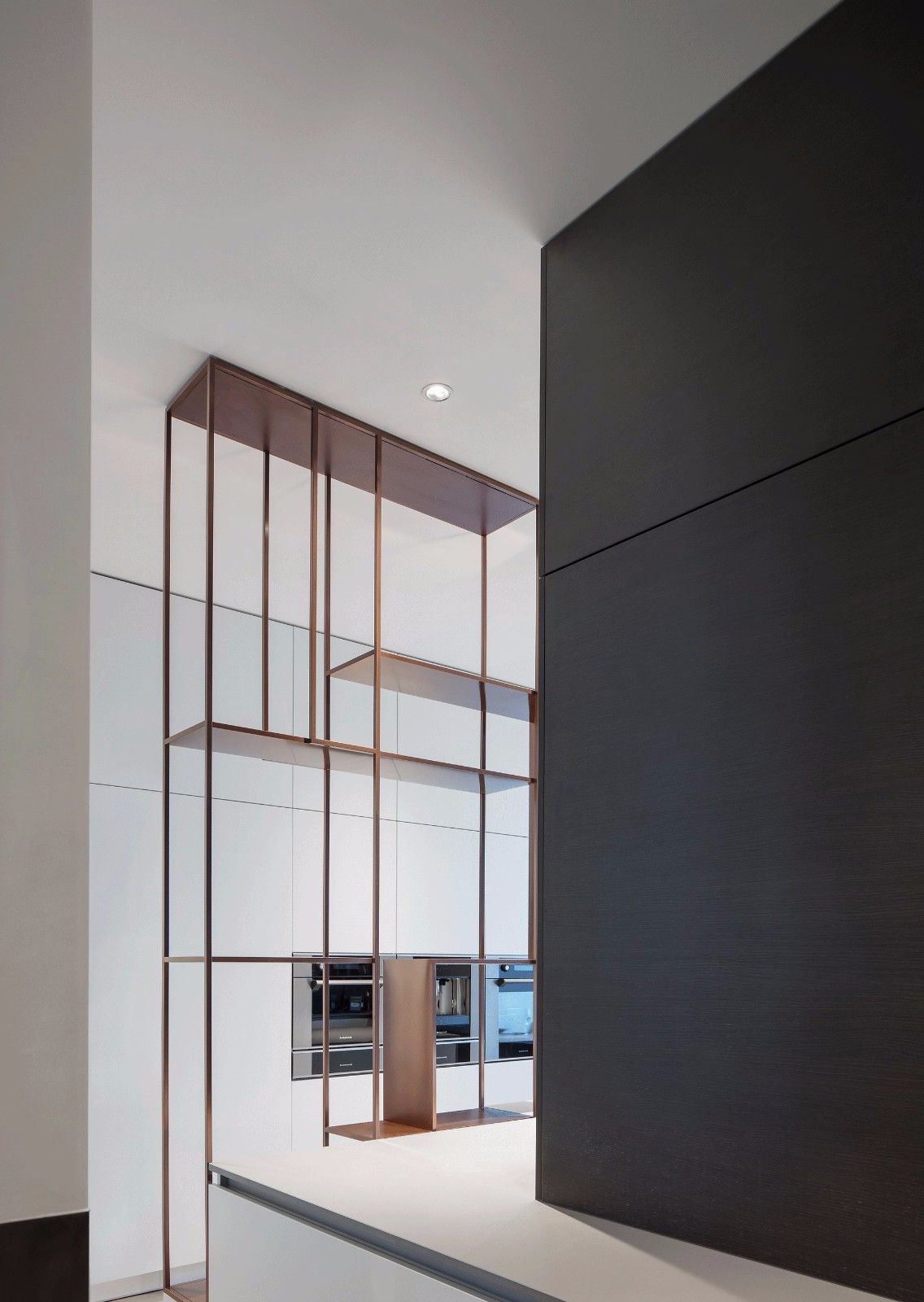 ▲厨房细节深色木纹与白色石材的色彩撞击,是模拟墨色在白纸上挥洒过的极致。不规则金色置物架的点缀,打破空间均衡感和沉稳的节奏,更加强烈地激发烹饪灵感。