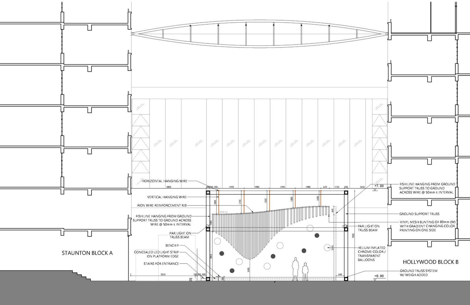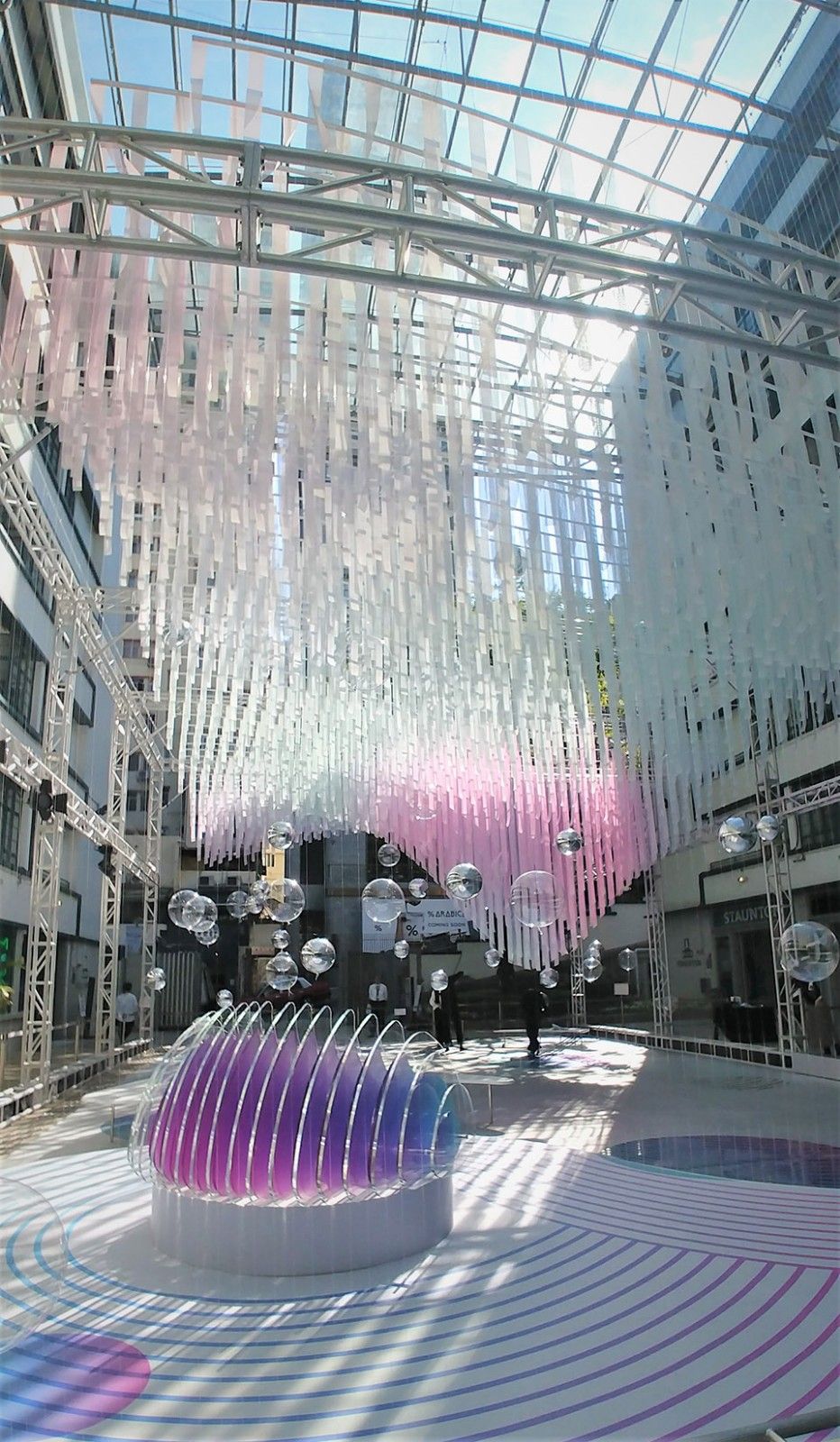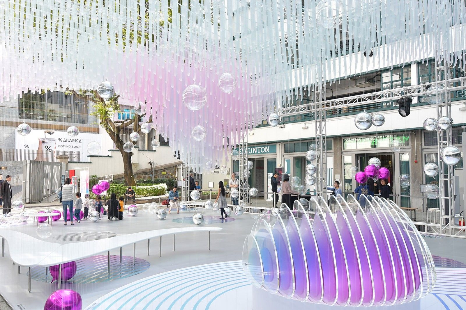 建筑师团队AaaM于今年圣诞在香港PMQ元创方庭院策划及设计了一个独一无二的圣诞展亭。在这个现代主义建筑物里,集当代艺术、设计与古迹活化共冶一炉的氛围下,随风晃动的绚丽气球,任意飘游,在没有雪景的香港,为公众带来飘飘冬日的另类城市风景。相对于现今高度商业化的香港,各大购物中心都争相以大型圣诞装置粉饰一番,而AaaM今年则为这创意地标设计了一个17米 X 11米的半透明海浪形轻型结构,悬挂于7米高庭院之上。海浪形云朵在展庭上空,尤如云浮腾动,外围则利用轻薄半透明鱼丝交织围网,飘移不定的缤纷氦气球,随微风在网内跃起降下,与参观者在这自由空间交流互动。 ▼展亭全景