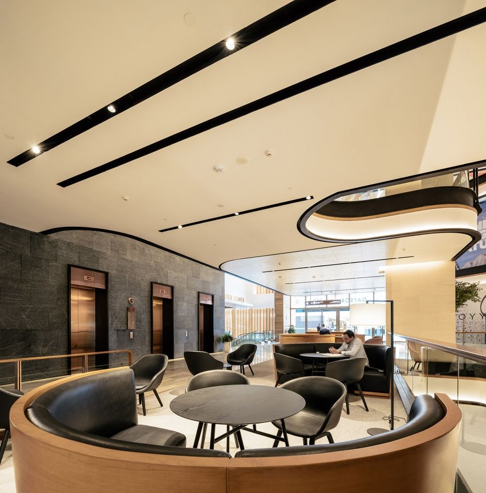 办公场所大堂大堂位于零售楼层的1层,是半下沉式结构,并与零售区相连,为去往办公室的人们提供了一定的私密度,同时通过视觉和材料的延续使用而使空间融入整个环境。大堂采用常见于泰国建筑的绿色植物和竖向木质百叶窗,以隔离嘈杂的车道并引入自然光线。两个大型灯笼的灵感来自传统的纸灯笼,为空间增添了一抹泰国文化气息。▼半下沉结构的办公场所大堂