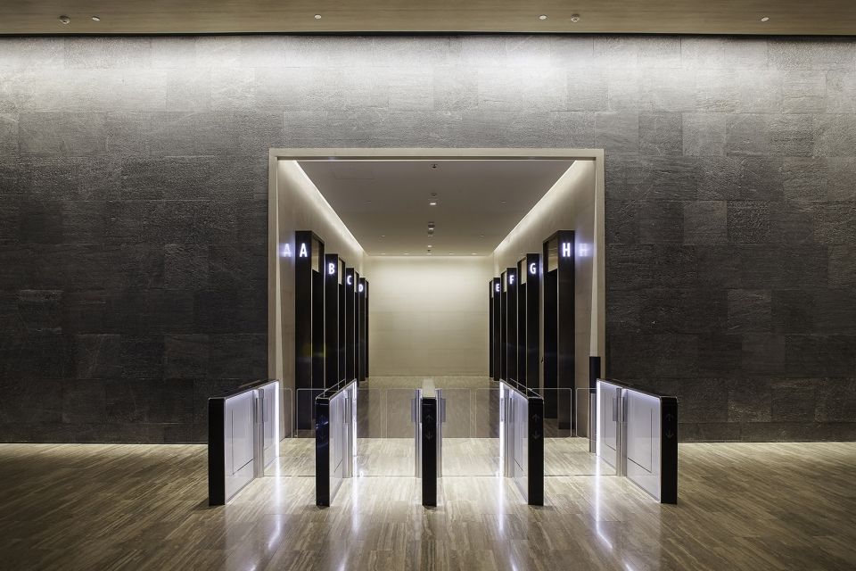 木材、绿化、金属工艺和水面反射的使用,旨在创造一个温暖、可触、宁静且富文化气息的环境,贯穿于4层高的零售裙楼、1层的办公区大堂入口、19和20层的会议场所、10至12层的美容和水疗中心以及策略性分布于整个建筑内的餐厅和咖啡厅。一座19米高的木质"蚕茧"耸立在新旧零售区之间的玻璃连接桥上,成为建筑物外部的一个醒目标志,也将落客区与零售楼层的各个层面在视觉上连接起来。▼连接 Gaysorn大楼和Gaysorn广场的一层入口