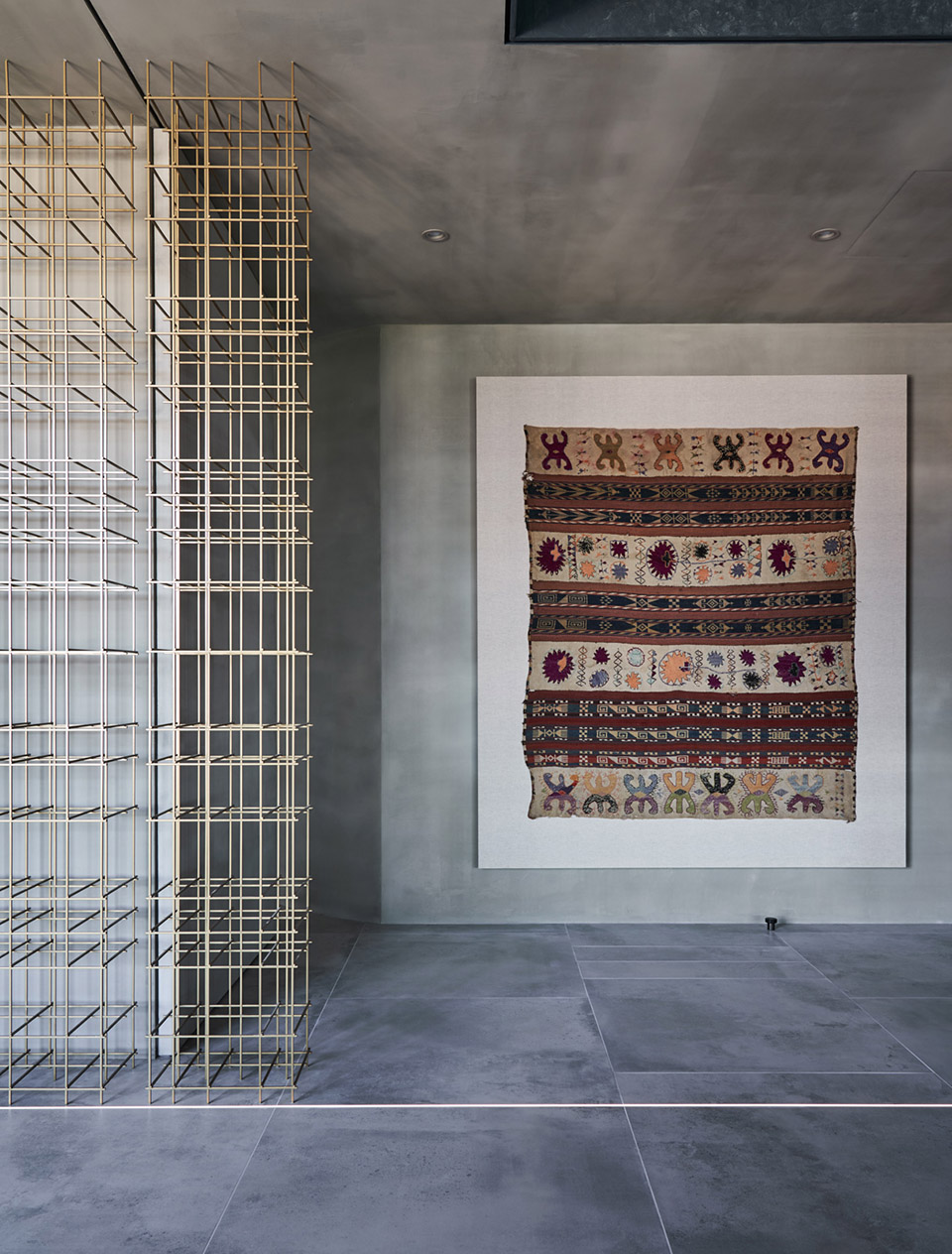 ▲入口混凝土糅合民族元素和工业设计,在入户玄关处利用民族元素的墙布增加艺术感,一侧的栅栏作为隔断设计呈现独特的视觉体验。