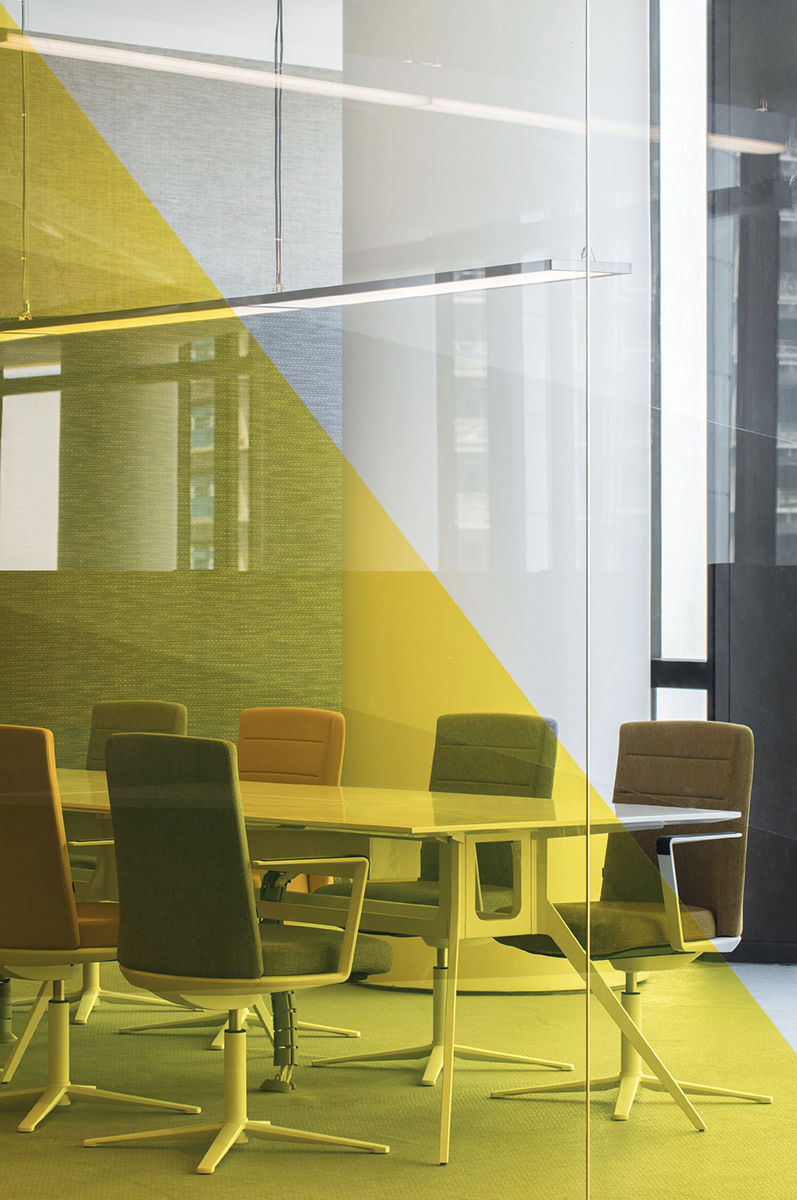 ▲办公玻璃办公区域的彩色玻璃带来通透且不单调的观感,明亮饱和的色彩、丰富的几何造型、以及线条的穿插运用带来强烈的视觉印象。