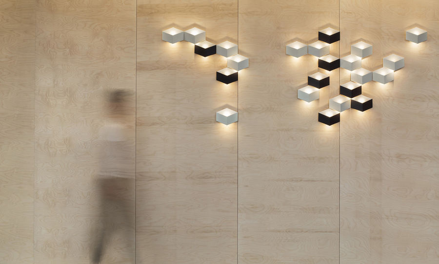 ▲接待台背景墙视觉美感与照明联系在一起,背景墙采用3D技术把正方体刻画出立体感,加入LED灯管照明,背景空间与艺术装置完美的结合在一起。