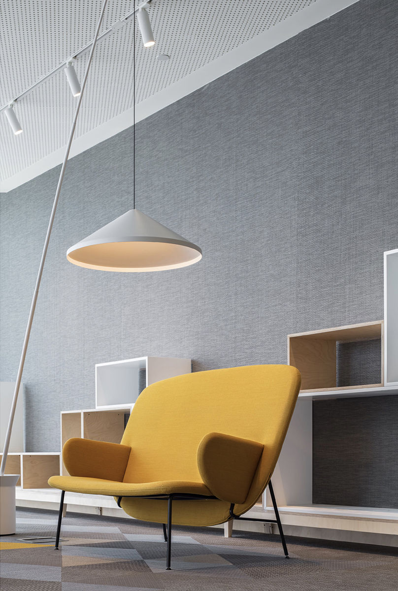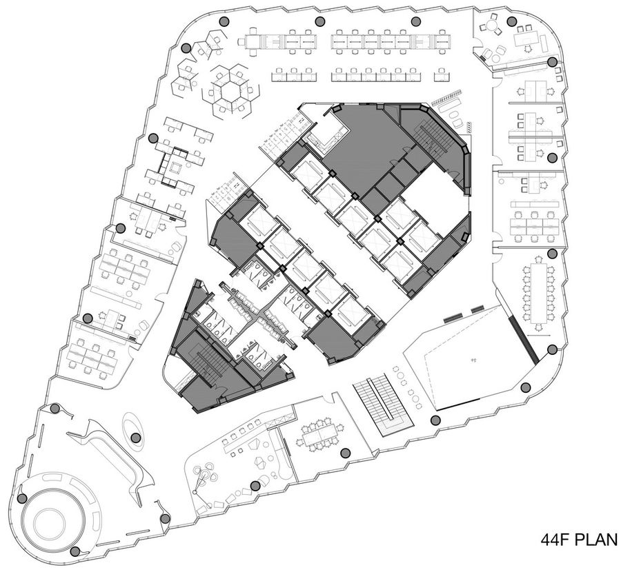 项目位于西安商业区的写字楼,两栋楼连接处正是集团的办公区,四菱形的办公区也激发了设计师把几何图形融入空间的灵感。