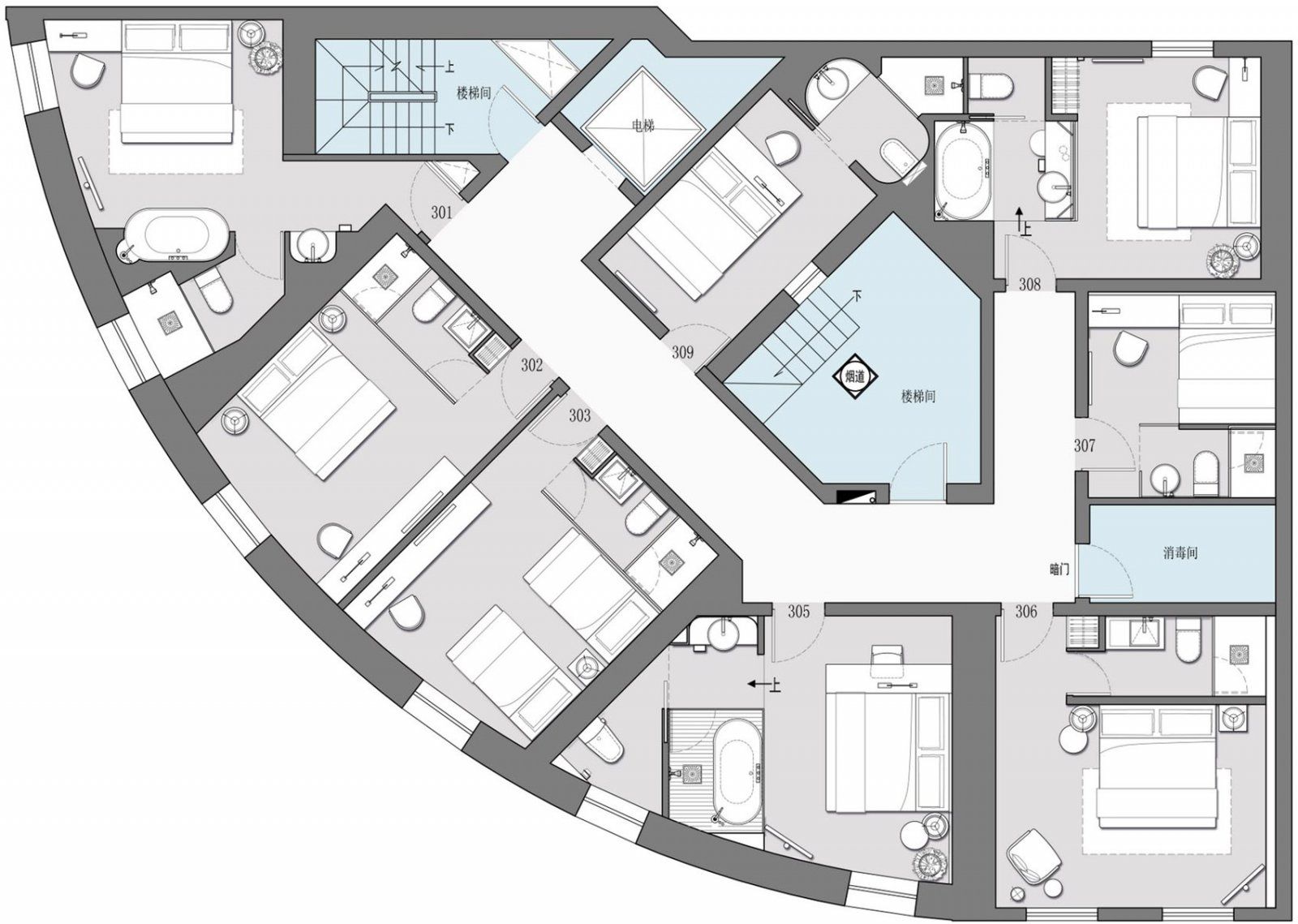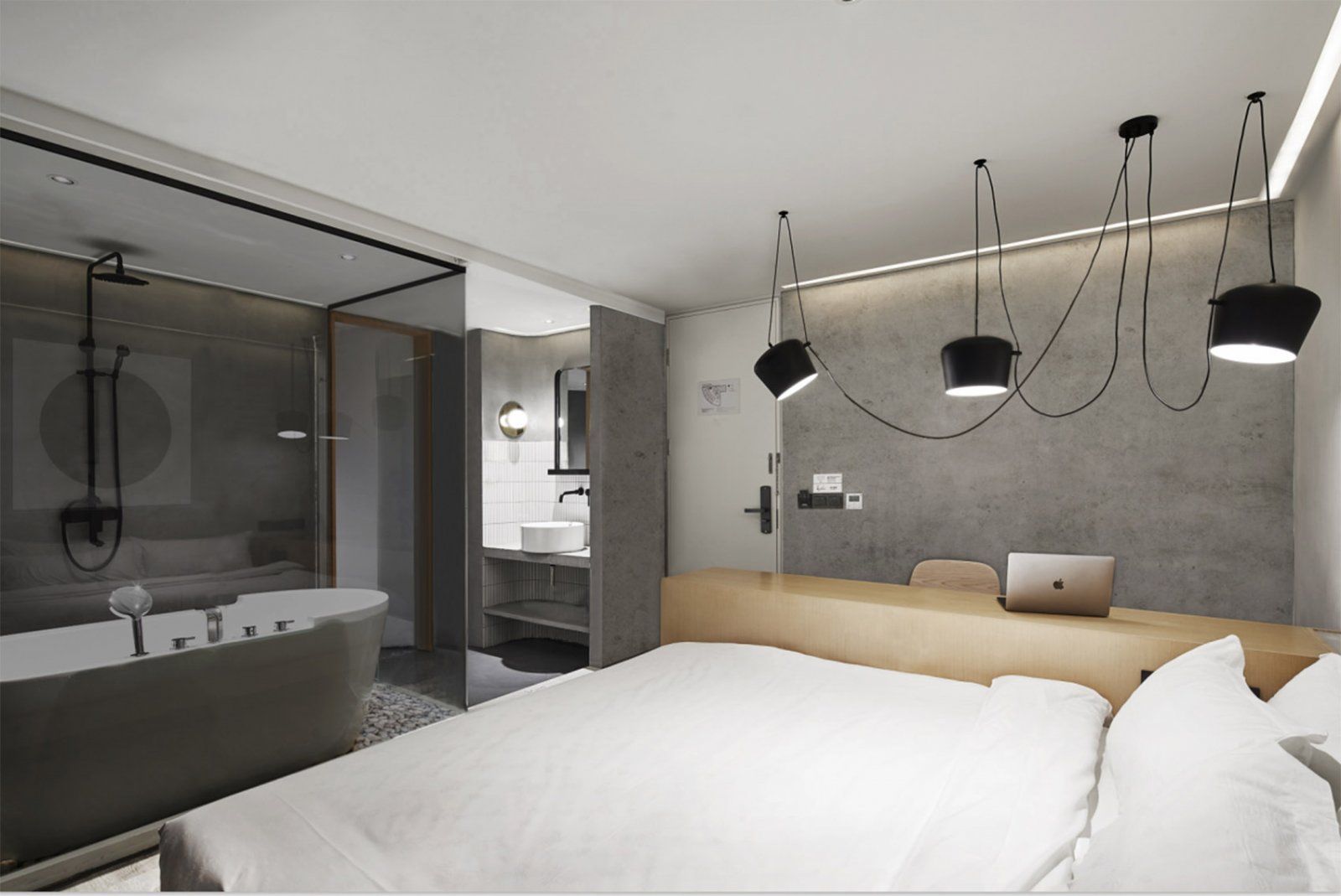 建筑本身是建造于20世纪40年代三层楼高的上海电报厂。精品酒店濒临豫园,同时与闪烁着璀璨灯光的外滩中心相对。目心设计研究室(MUXIN DESIGN)对这一建筑的改造设计理念基于"新"与"旧"的融合和鲜明对照,原有的混凝土结构大部分被保留还原,大量新加入细腻的水磨石,粗糙和细腻的对比仿佛在叙述着传统电报行业与现代化信息社会的变革。而对原建筑四层进行的露台改造,不仅与旧城民居产生了传统与现代情感上的共鸣,更为此建筑赋予了历史和本土文化的背景。