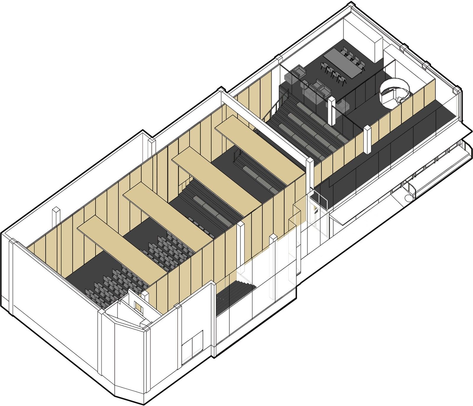 侧面的每一品转轴翻板的宽度在1米左右,最高的单元高度达到7米,开时形成约2米宽的空洞,关闭时完全封闭为一面墙壁。打开时,两侧的空间被连通,视线形成交流,人流可以从该处进入,自然光线被引入空间的内部,声音则可以从内部穿透到外部。关闭时,两侧的空间被阻隔,视线和人流被切断,空间内的采光转变为可控的人工光线,同时空间内部形成隔绝的声场。顶部的翻板每一品高1.8米,宽7.6米,开启时下垂,关闭时升起呈水平,也可以停止在中间的任何角度。起到调节空间高度和隐藏顶部设备层的作用。所有翻板厚度为5厘米,采用了特殊的高强度蜂窝板作为材料。在背光时这种材料呈现半透明的状态,此时可以看到整块翻板内部并没有龙骨,光线在材料内部均匀的扩散,细看时还可以发现材料表面的纤维质感。