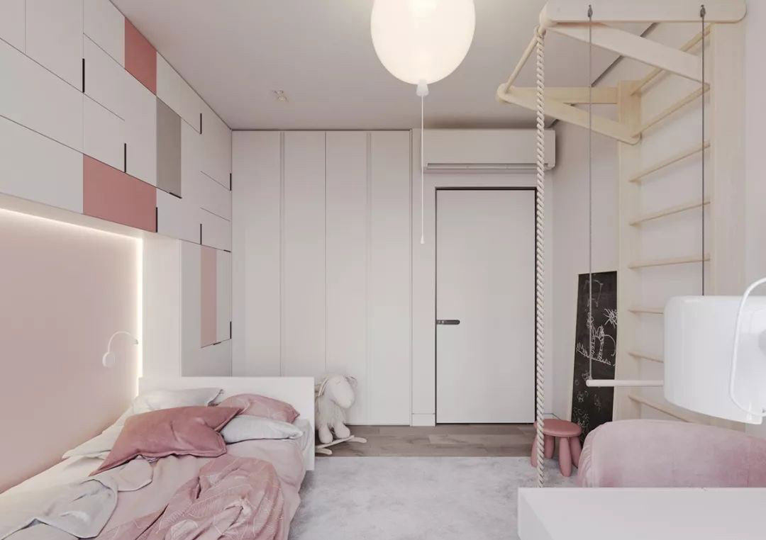 粉色系的女儿房结合学习与休息功能,衣柜与折叠床合二为一的设计增加了亲子玩耍空间。窗边放置书桌为孩子提供学习场所。然而最惊艳的还是天花板上的气泡吊灯与墙上的粉色叶片壁灯了。