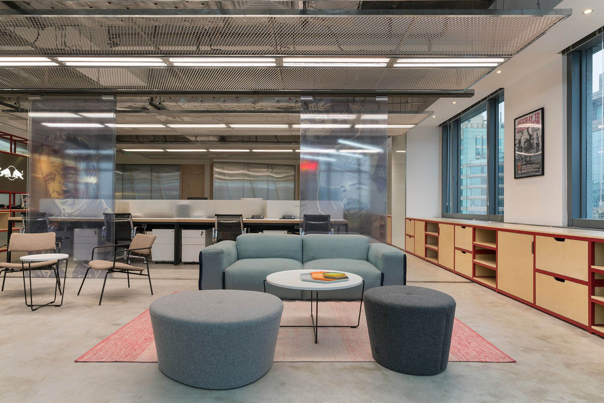 The main office space is divided into open office area and flexible lounge-pantry-event space. The main room is visually divided by sliding glass panels with playful deconstructed Red Bull hero graphics.